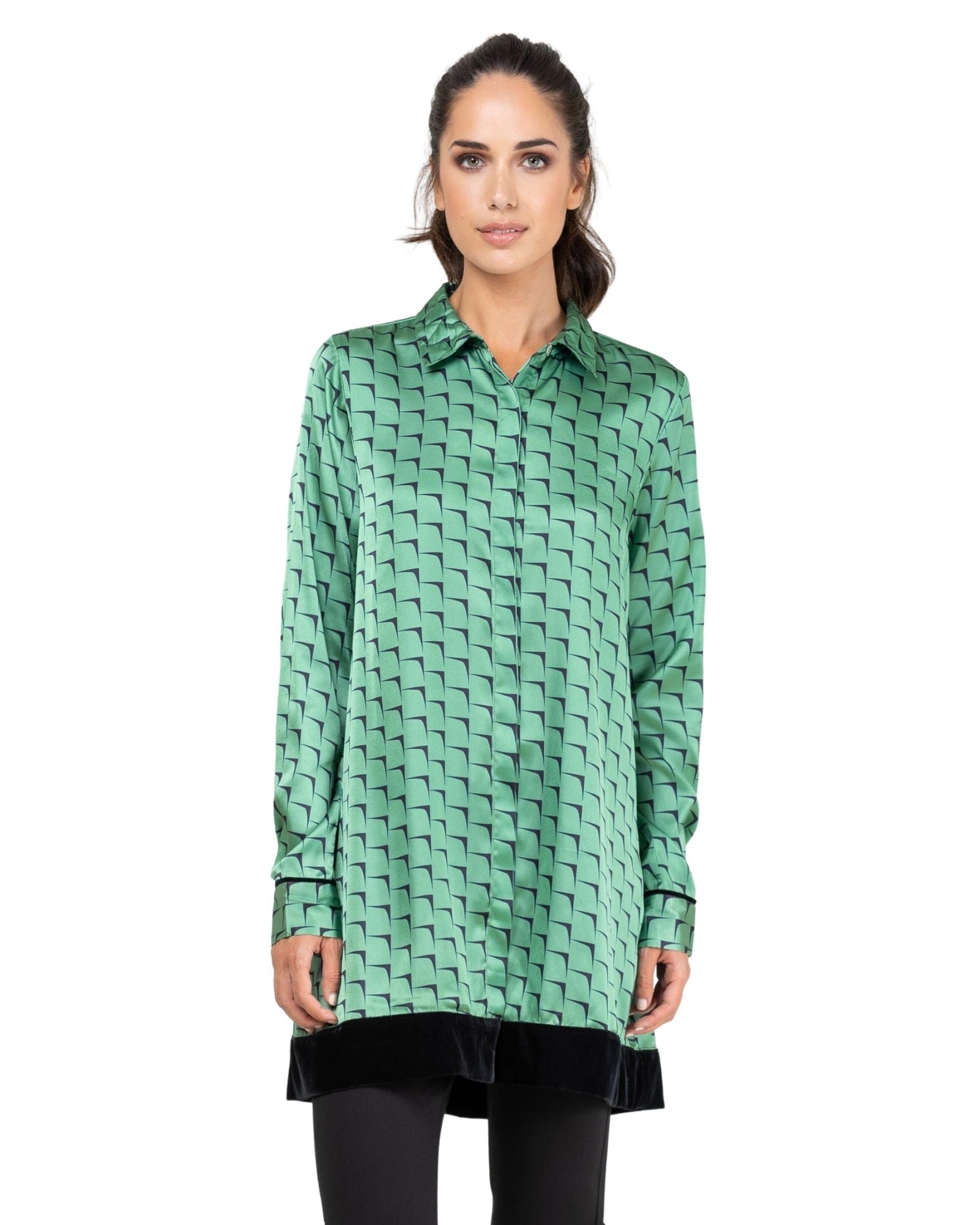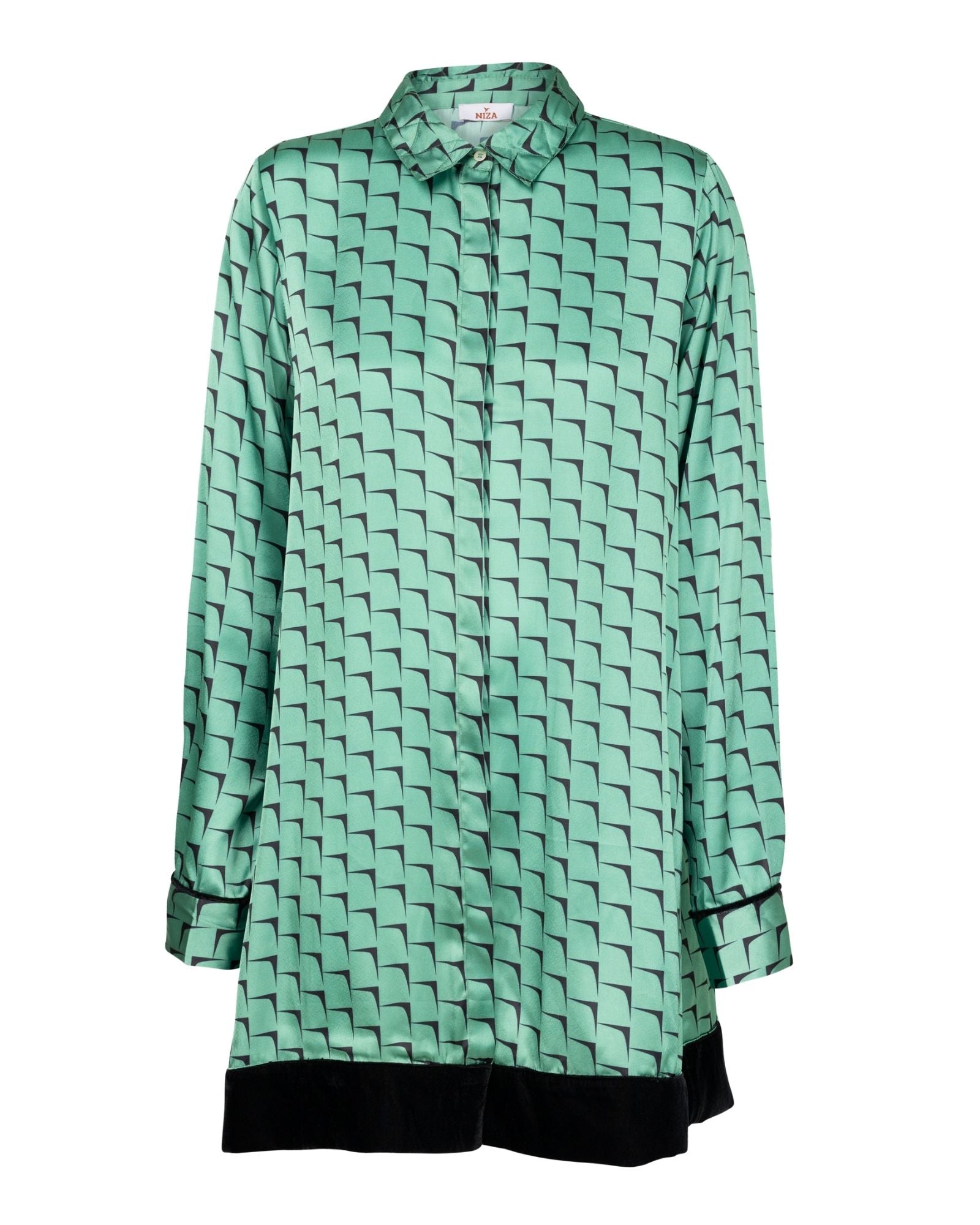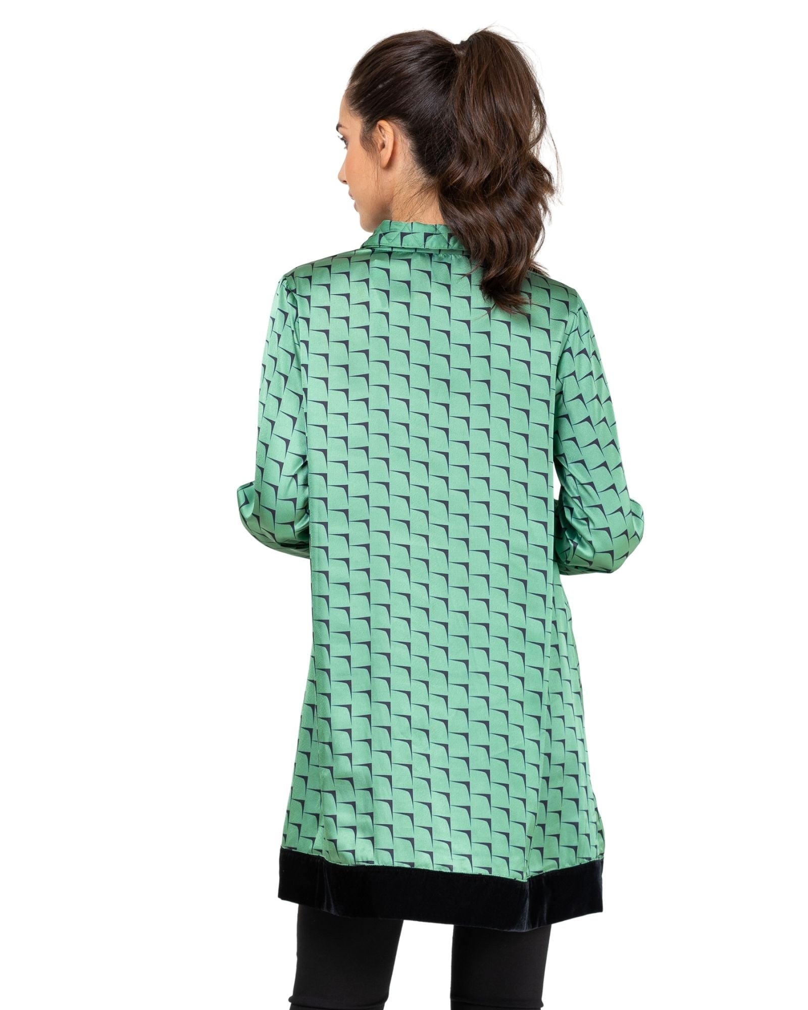 Túnica satinada con estampado. Cuello tipo camisa. Abotonado frontal oculto con solapa. Manga larga acabada en puño. Bajo de túnica acabado en terciopelo.