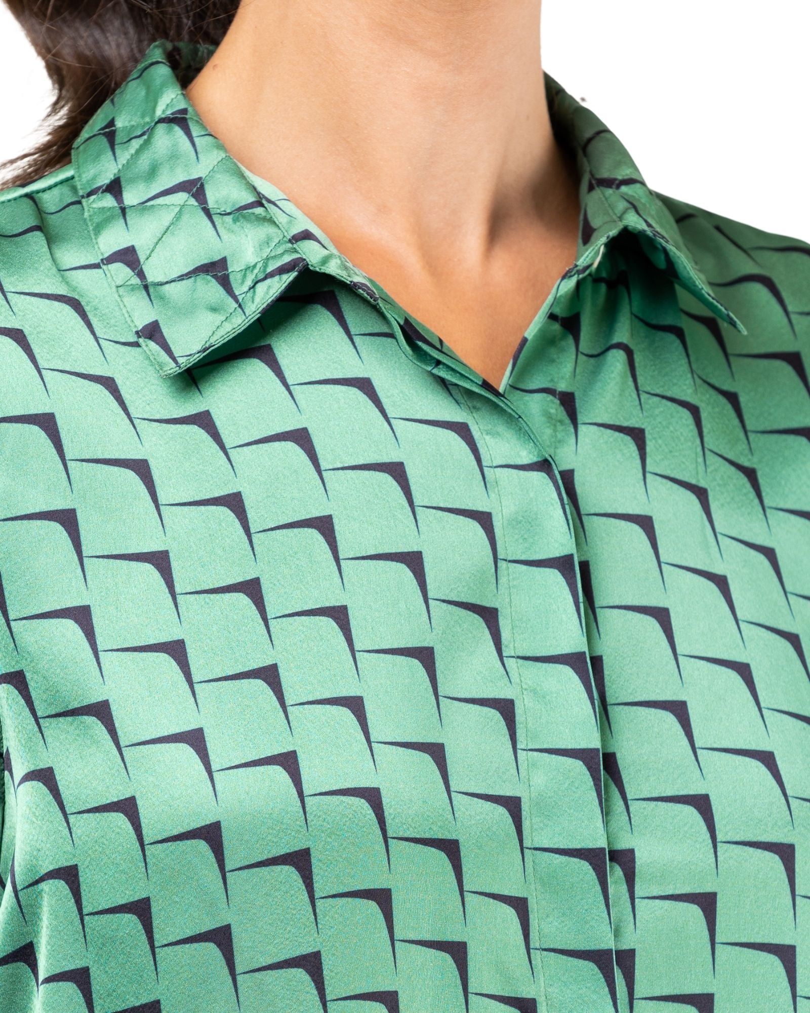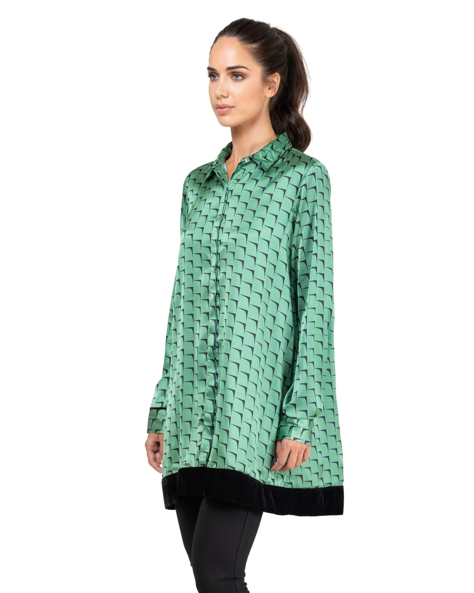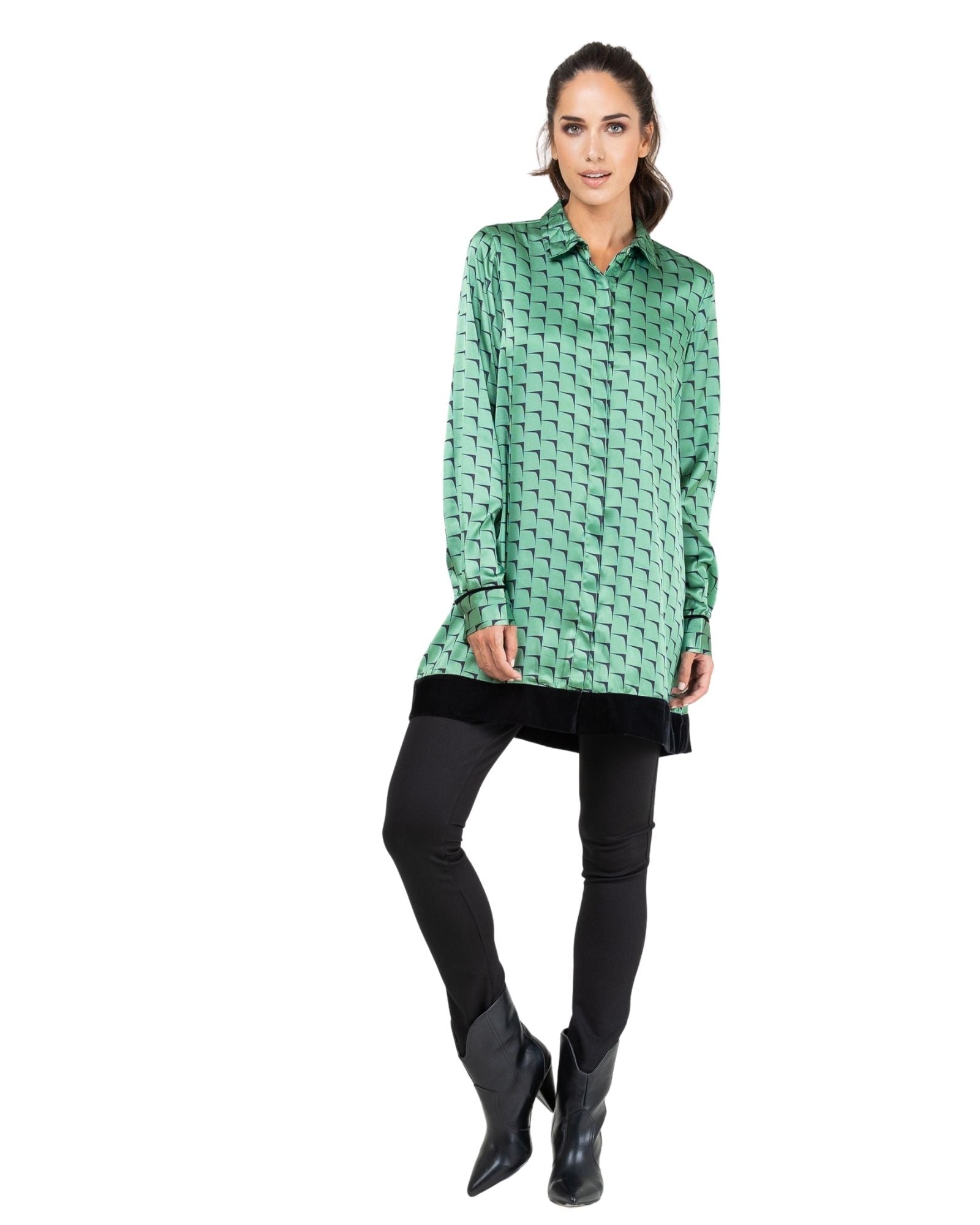 Túnica satinada con estampado. Cuello tipo camisa. Abotonado frontal oculto con solapa. Manga larga acabada en puño. Bajo de túnica acabado en terciopelo.