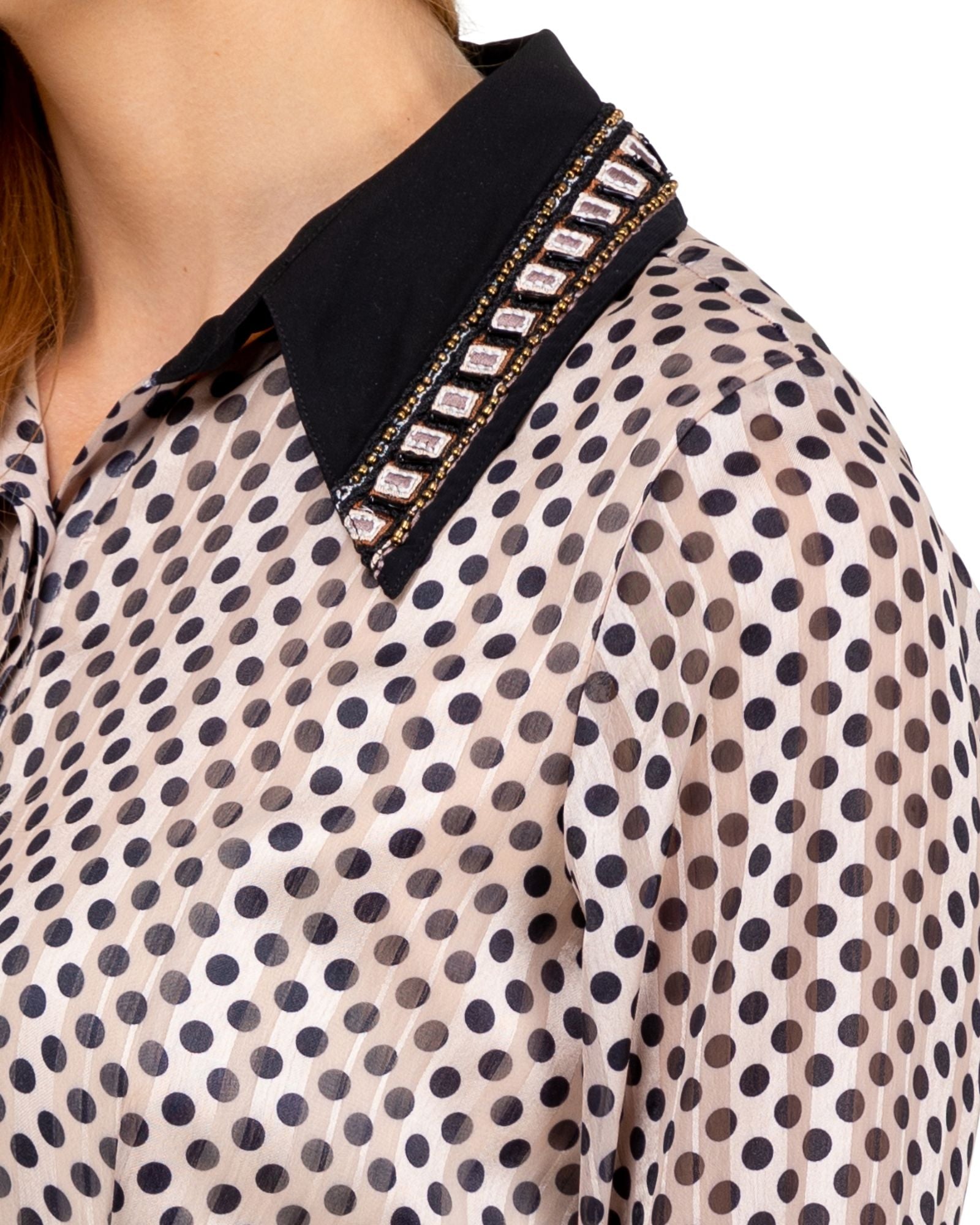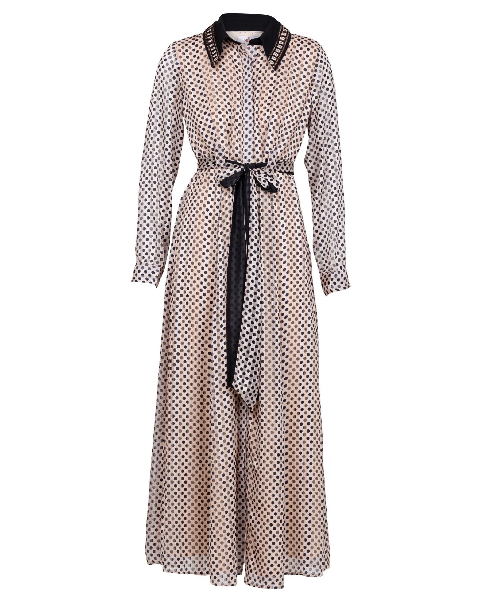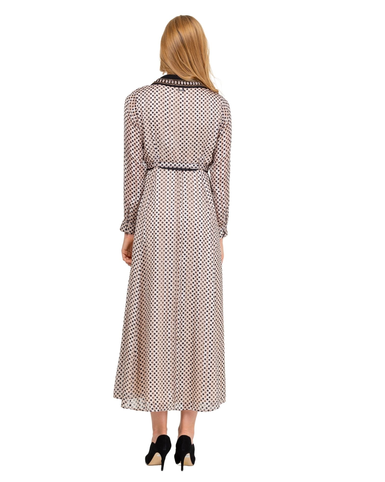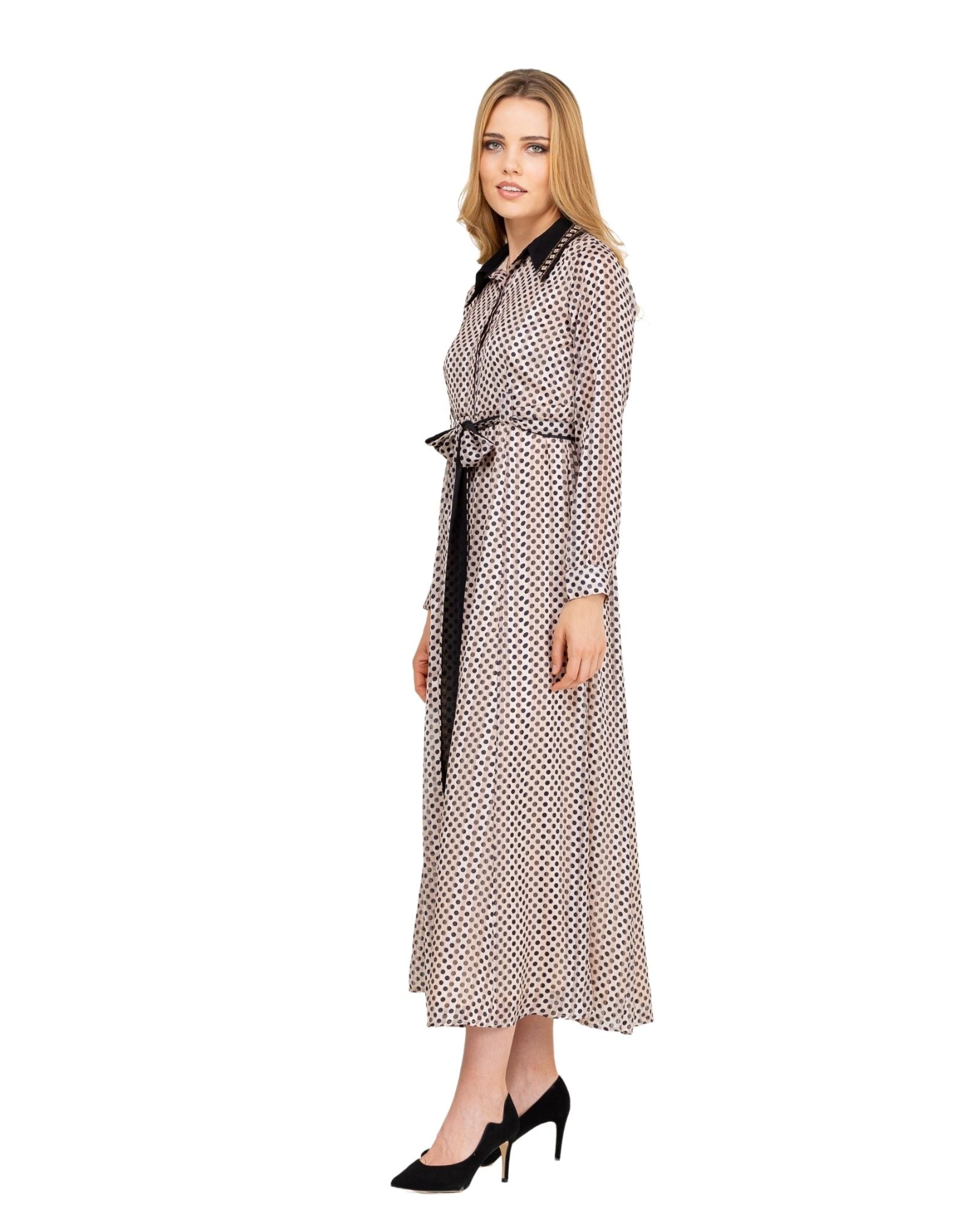 Vestido estampado. Cuello bordado. Abotonado frontal oculto con solapa. Corte en cintura con lazada opcional. Manga larga acabado con puños abotonados.