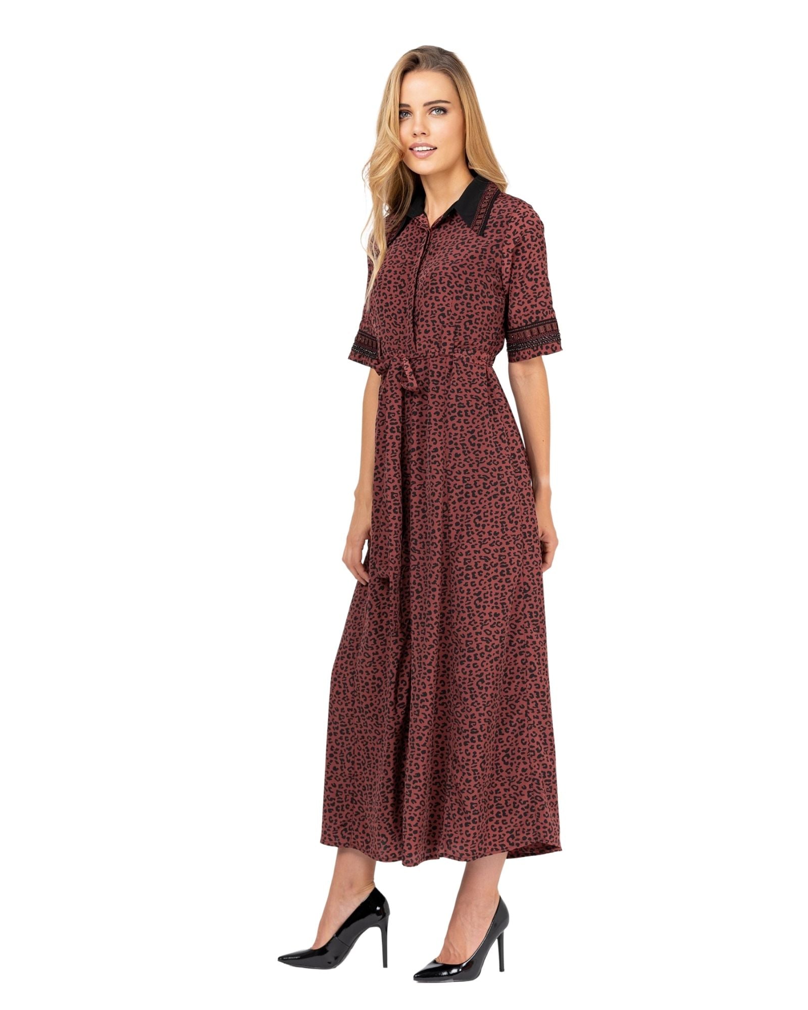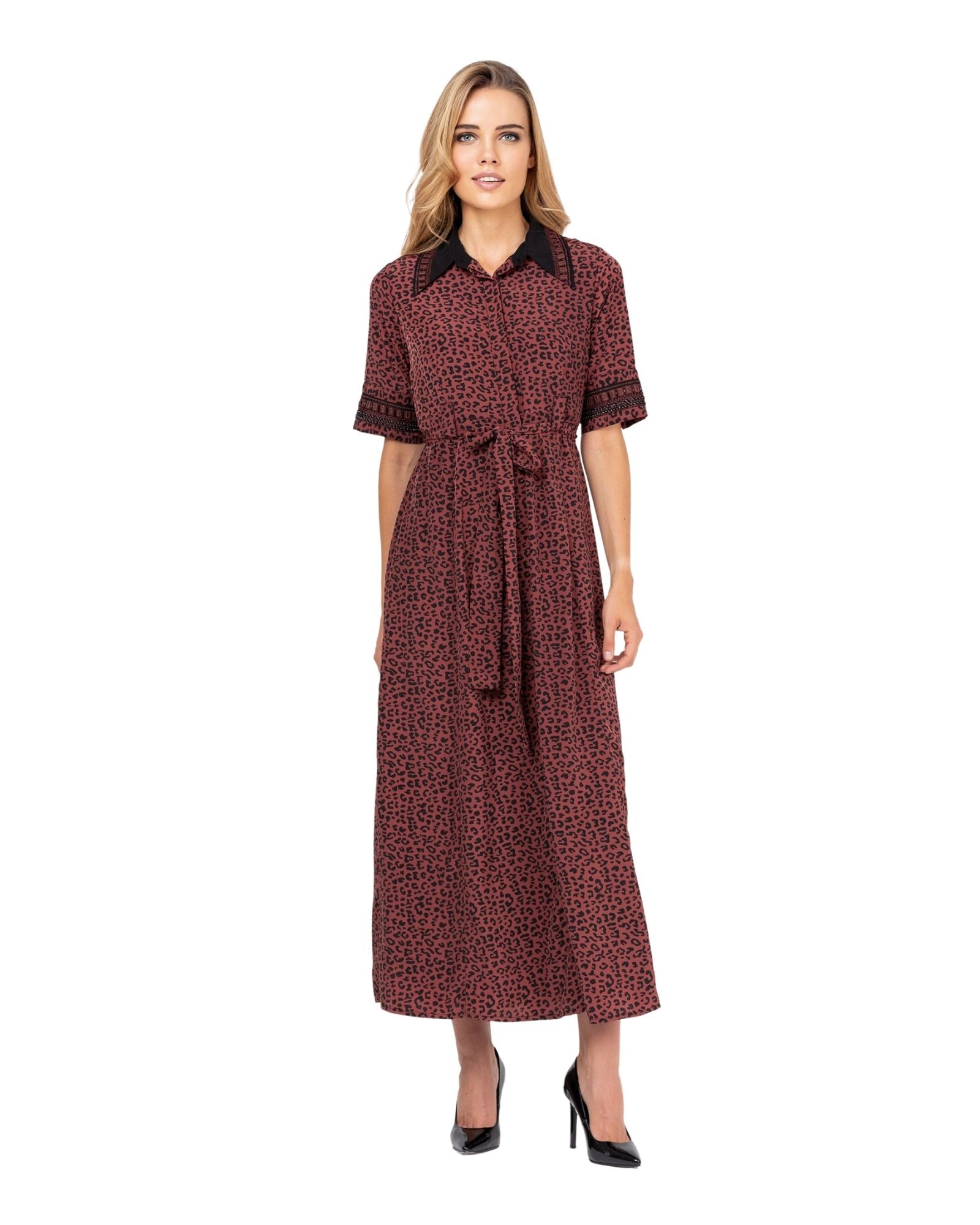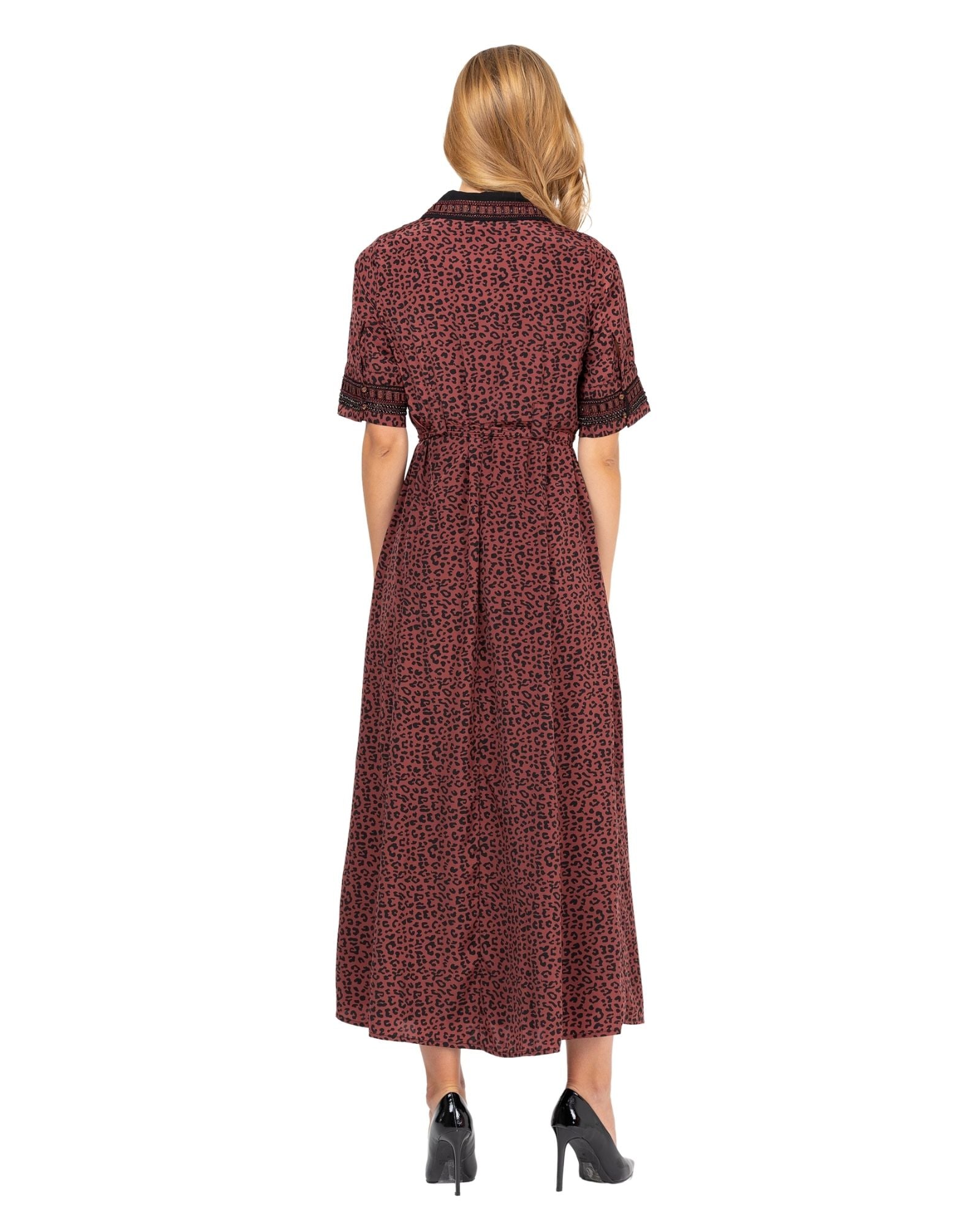 Vestido largo con tejido fluido Estampado de animal print y abotonado oculto en el frente. Cuello tipo camisa. Manga corta. Bordado en cuello y mangas. Lazada en cintura.