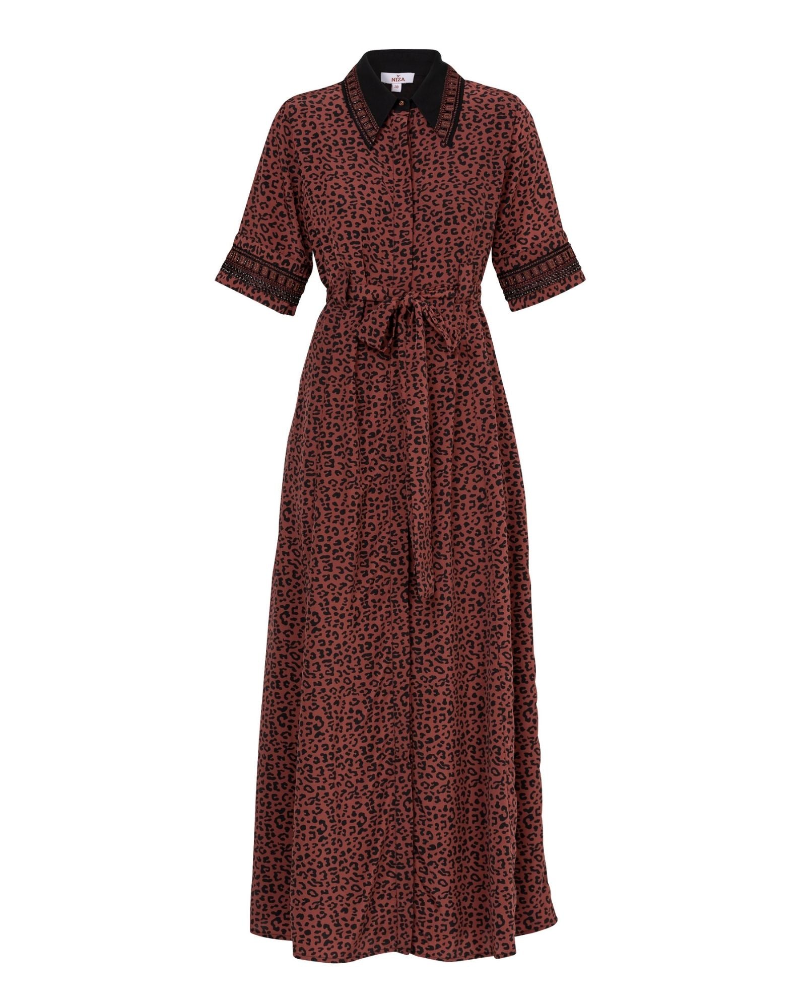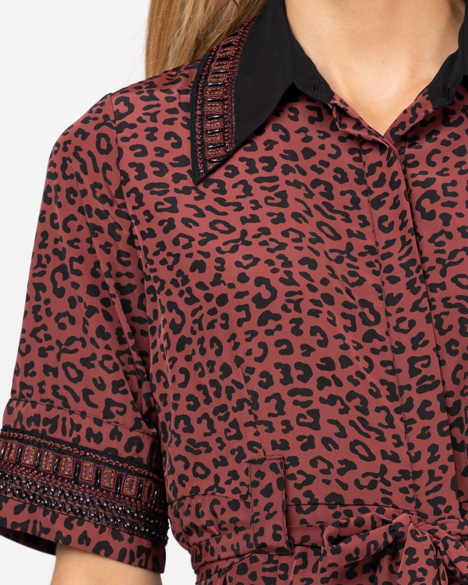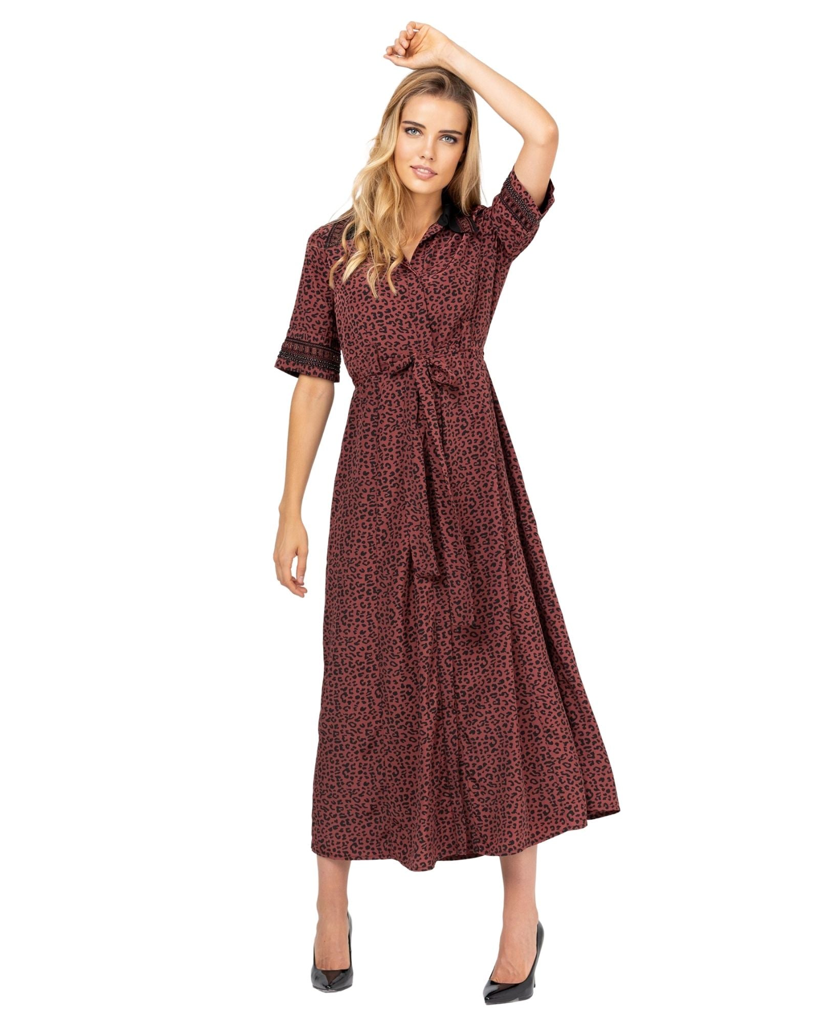 Vestido largo con tejido fluido Estampado de animal print y abotonado oculto en el frente. Cuello tipo camisa. Manga corta. Bordado en cuello y mangas. Lazada en cintura.