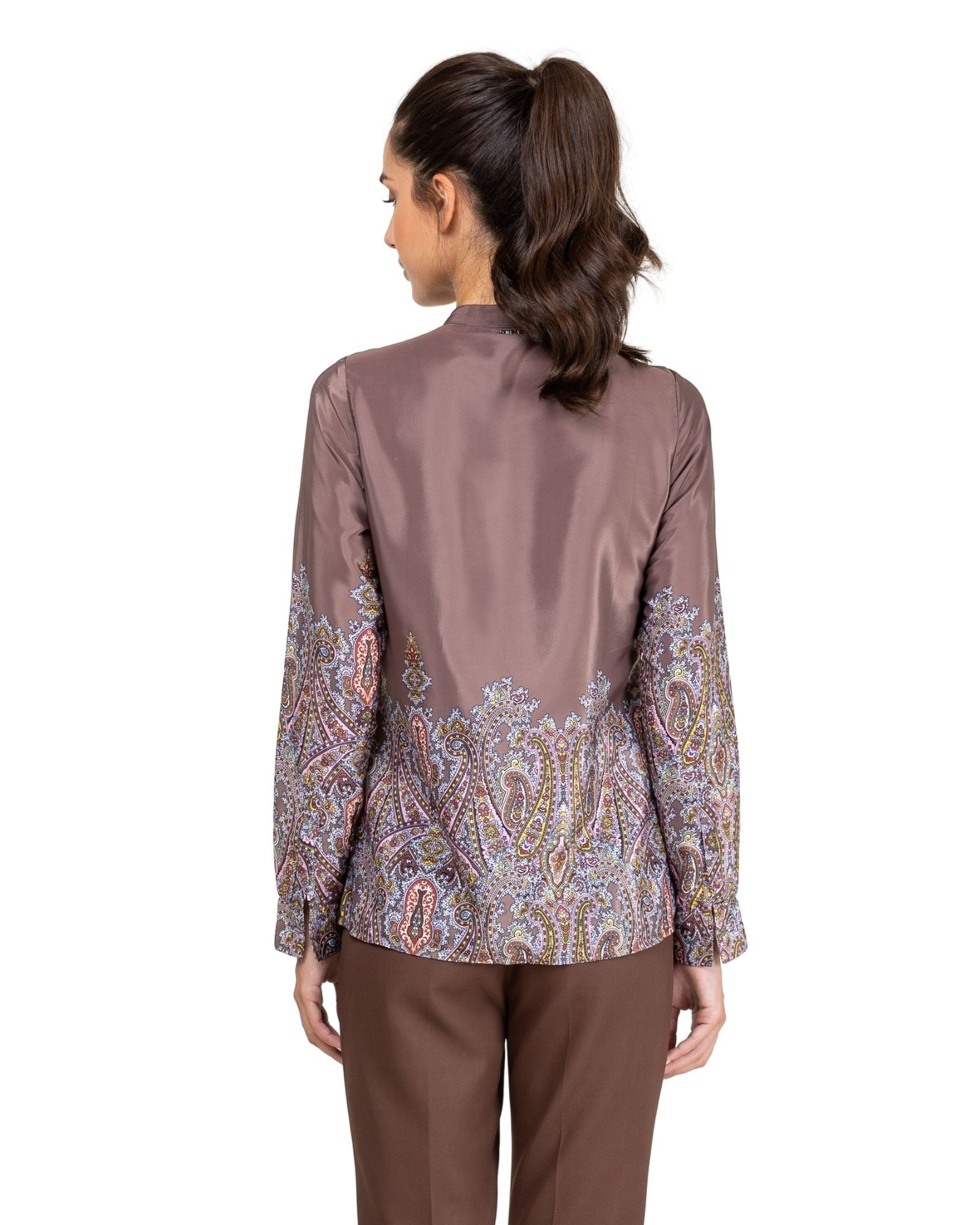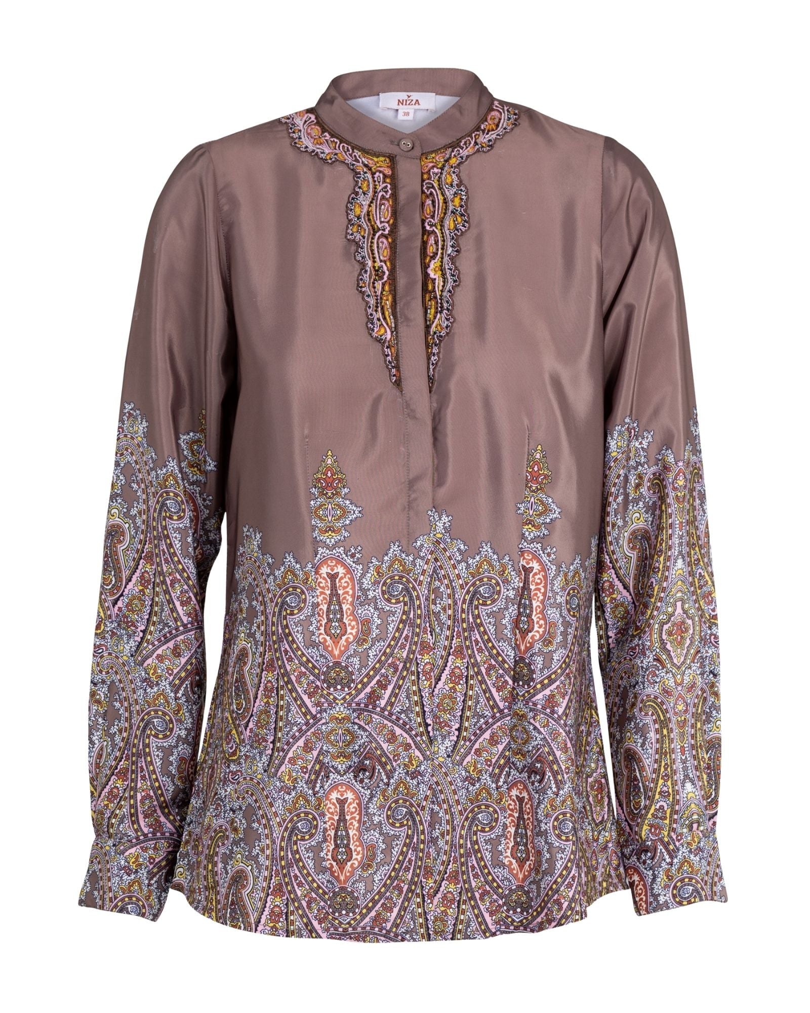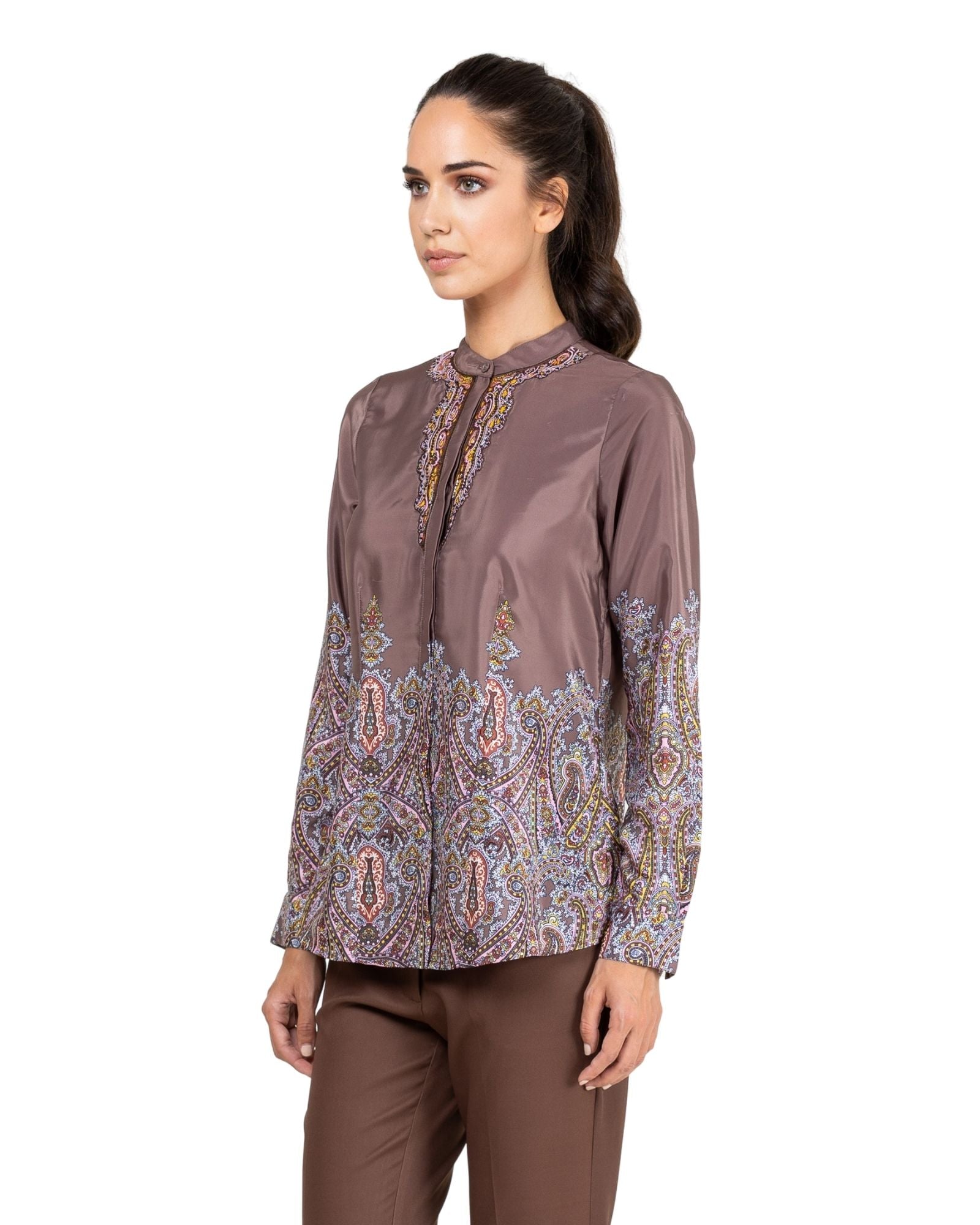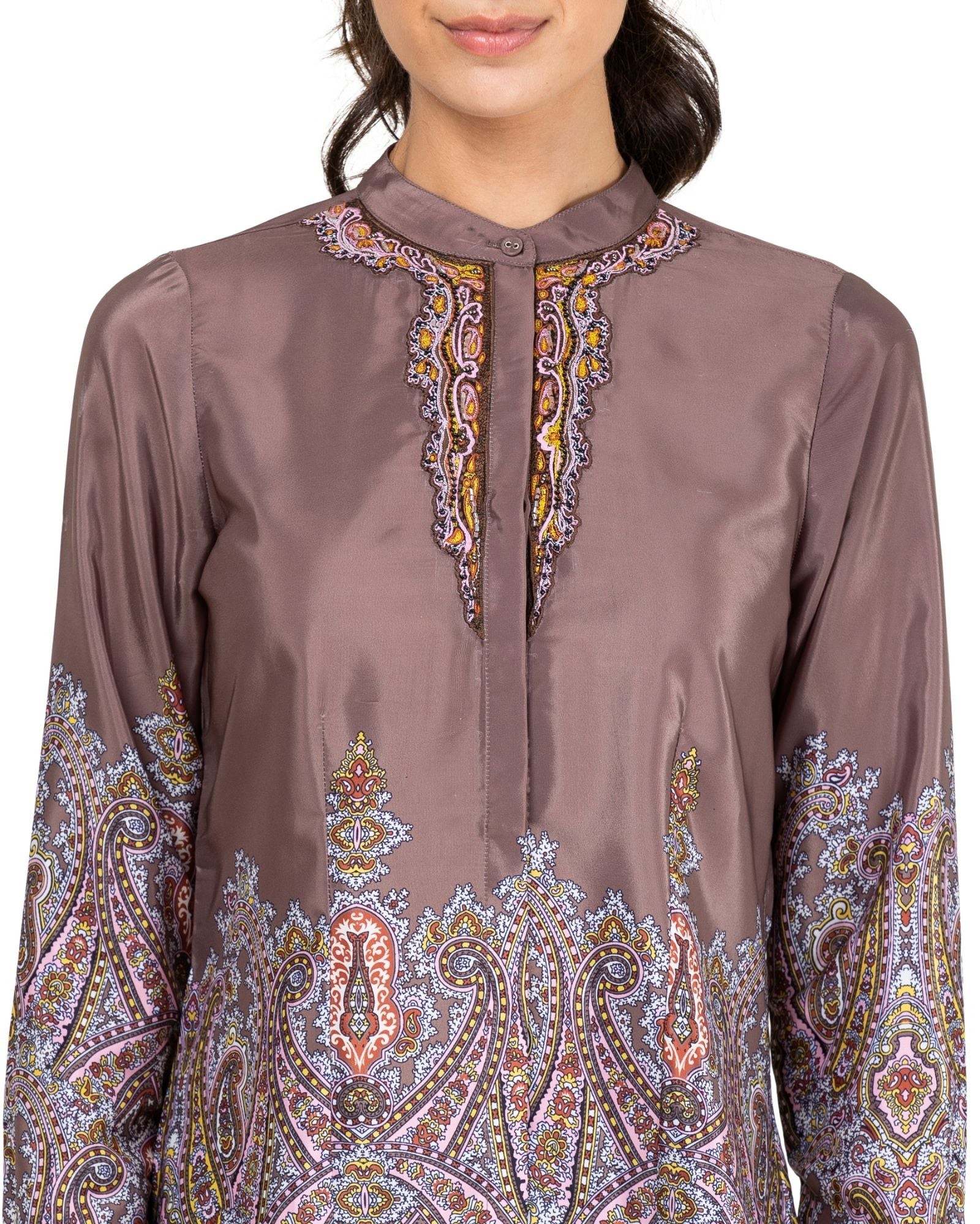 Blusa satinada, corte recto con detalles estampados tipo paisley. Cuello redondo tipo mao. Bordado de pedrería en el pecho. Cierre delantero con botones y tapeta. Manga larga con puños abotonados.