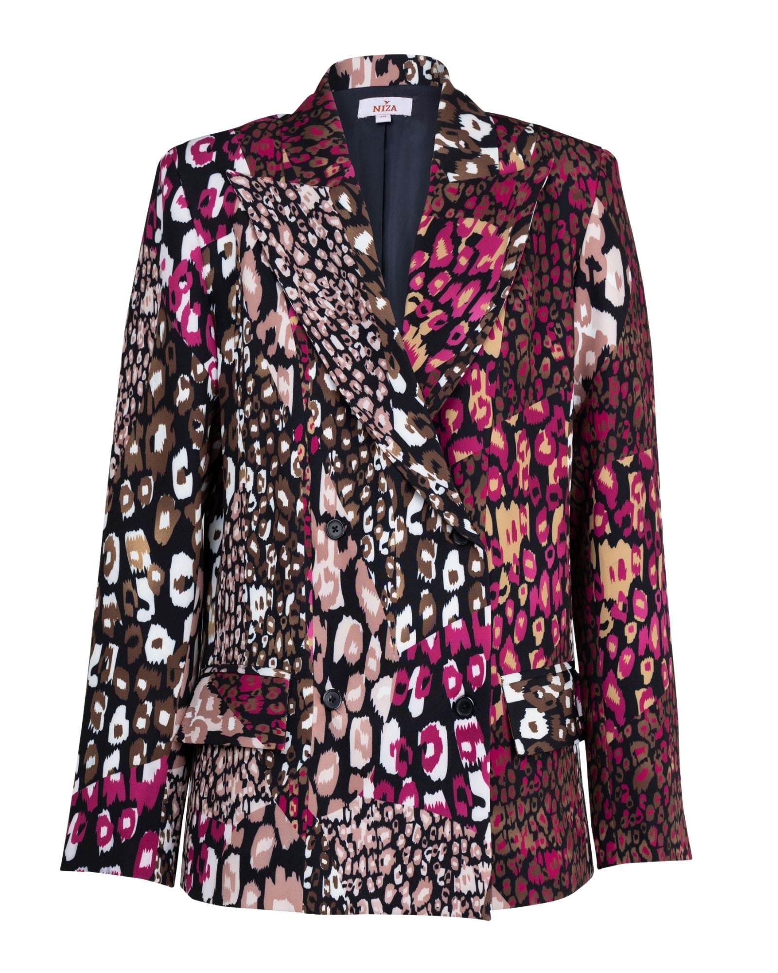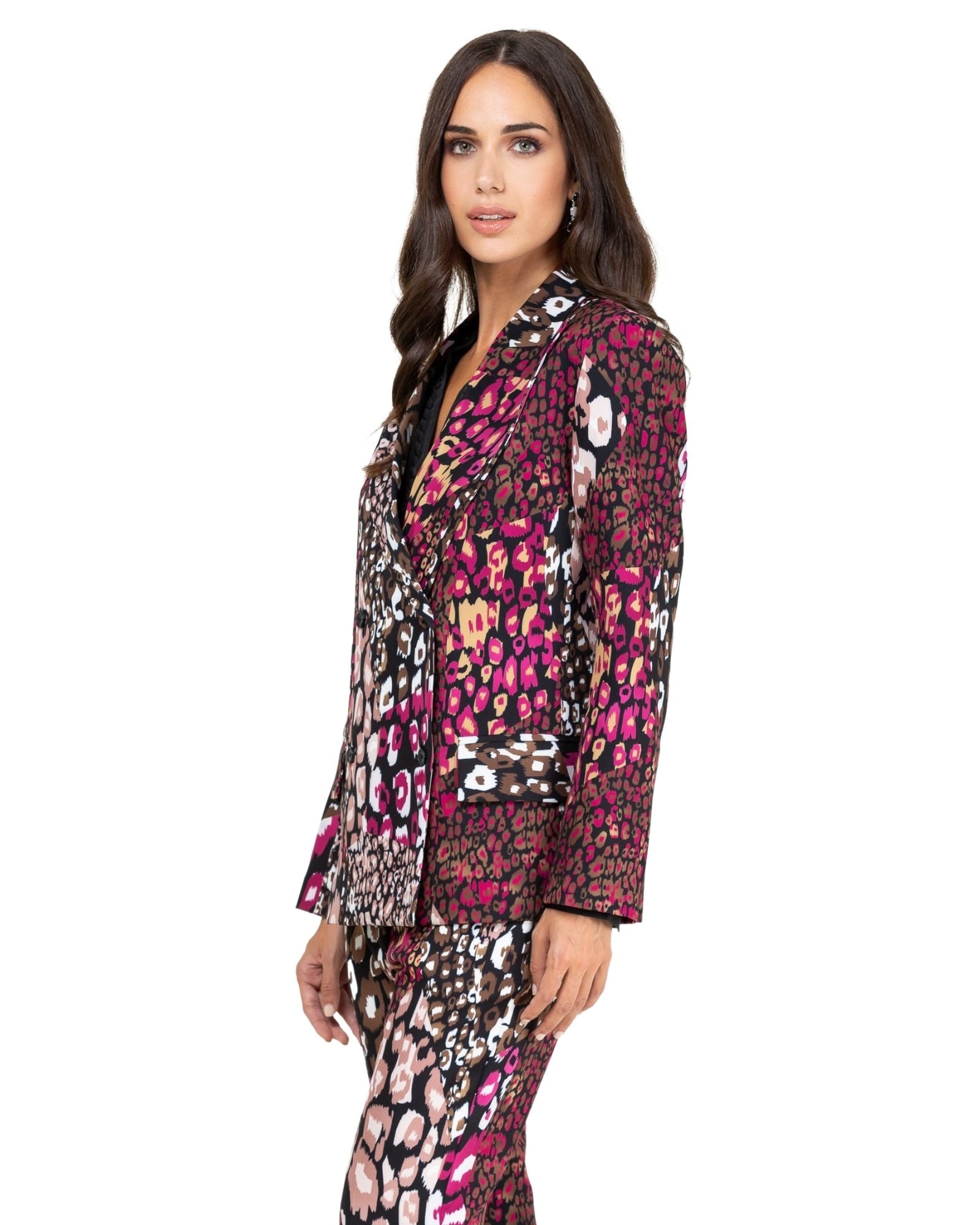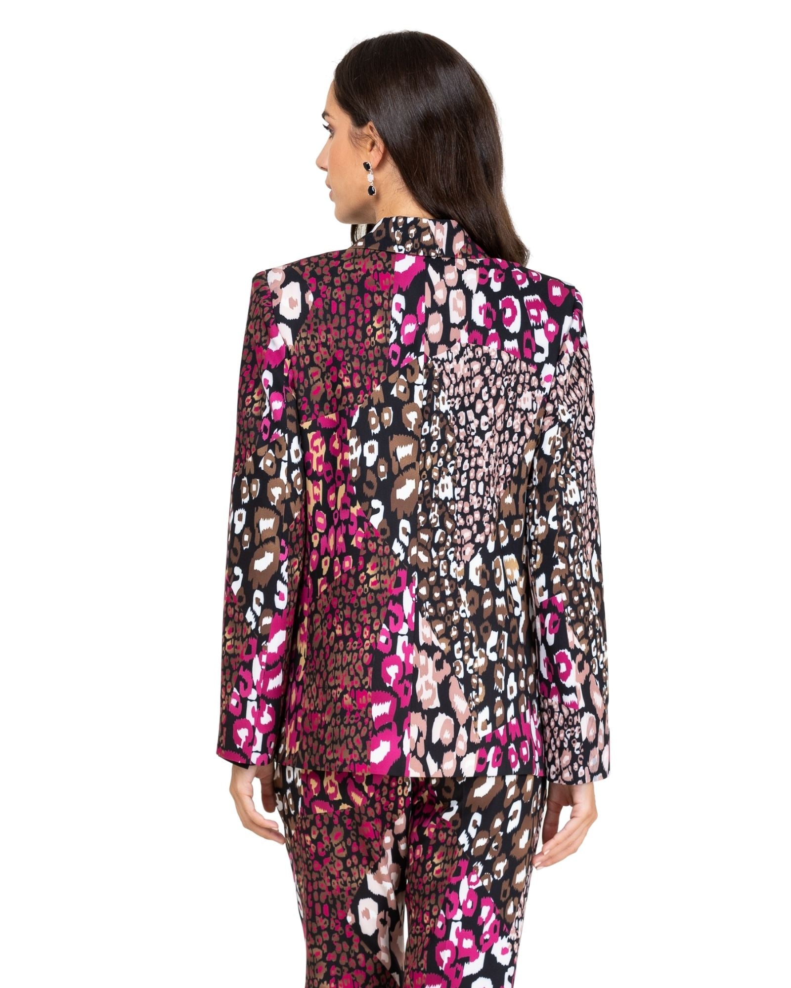 Blazer cruzado con solapa. Estampado animal con toques fuscia. Cierre frontal cruzado con botones. Manga larga. Bolsillos laterales.