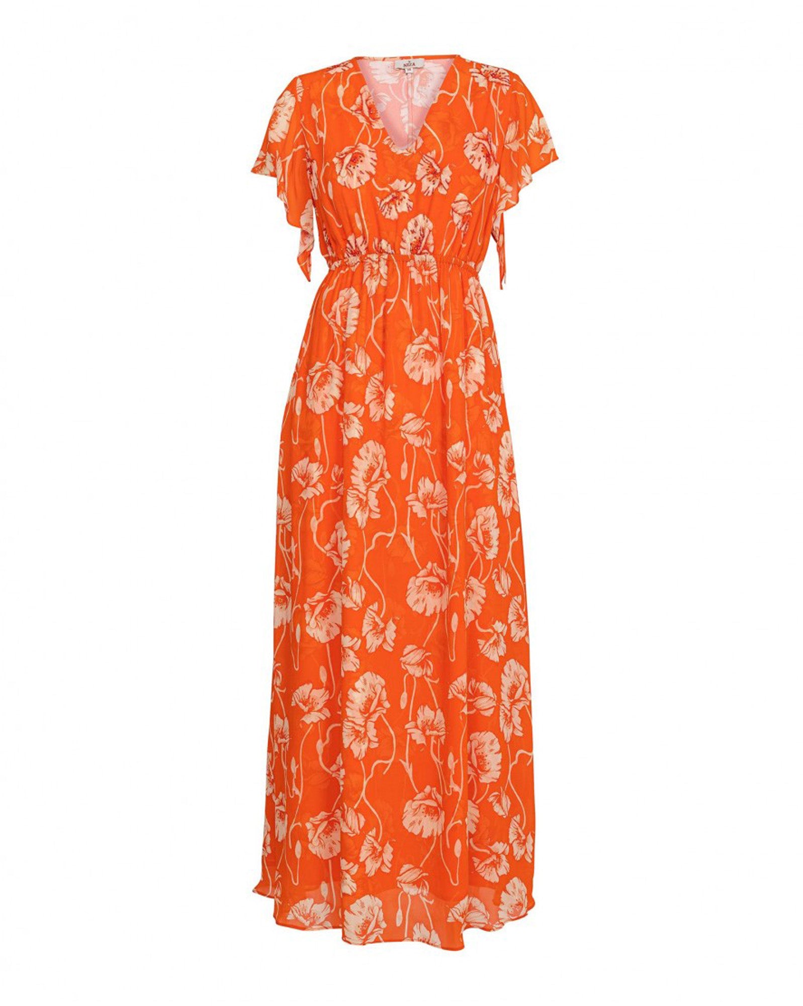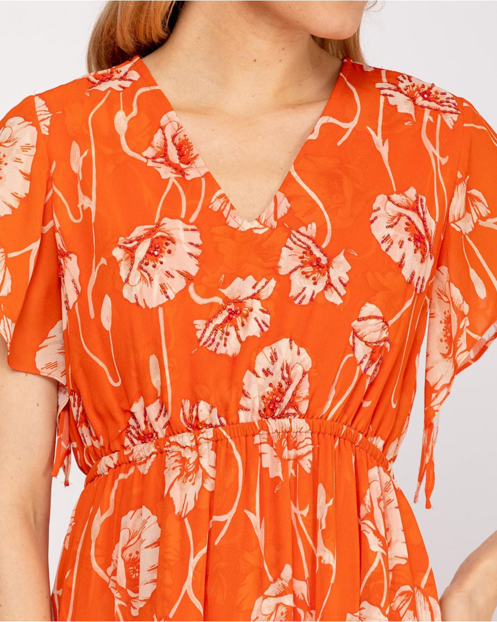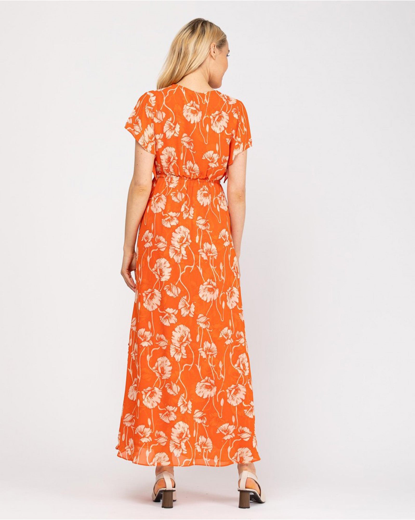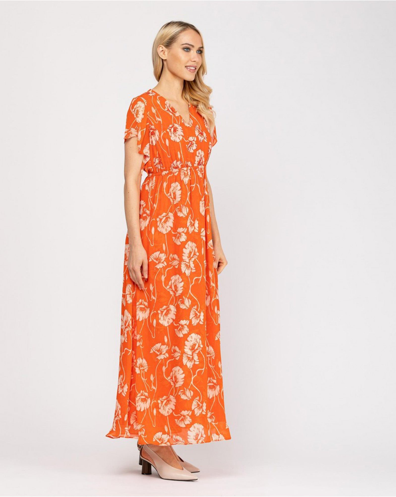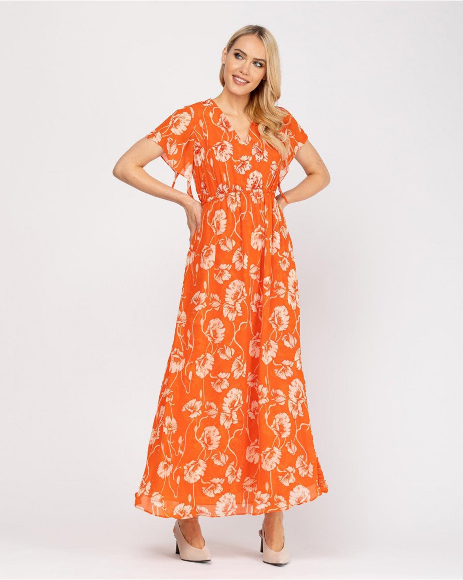 Vestido largo corte imperio, cuello en V con manga corta tipo tulipan, con resorte debajo de busto y estampado floral.