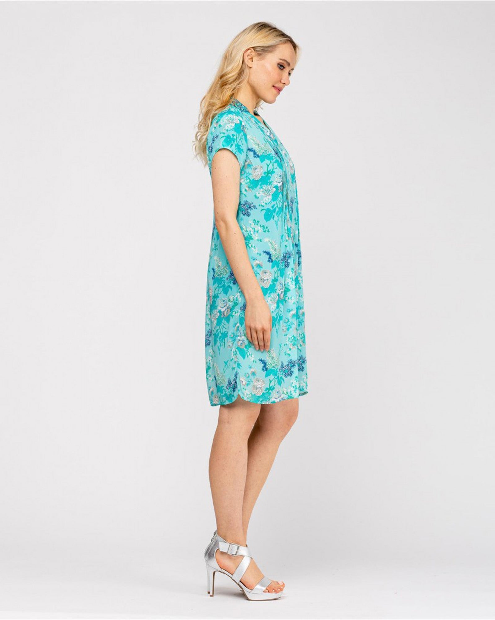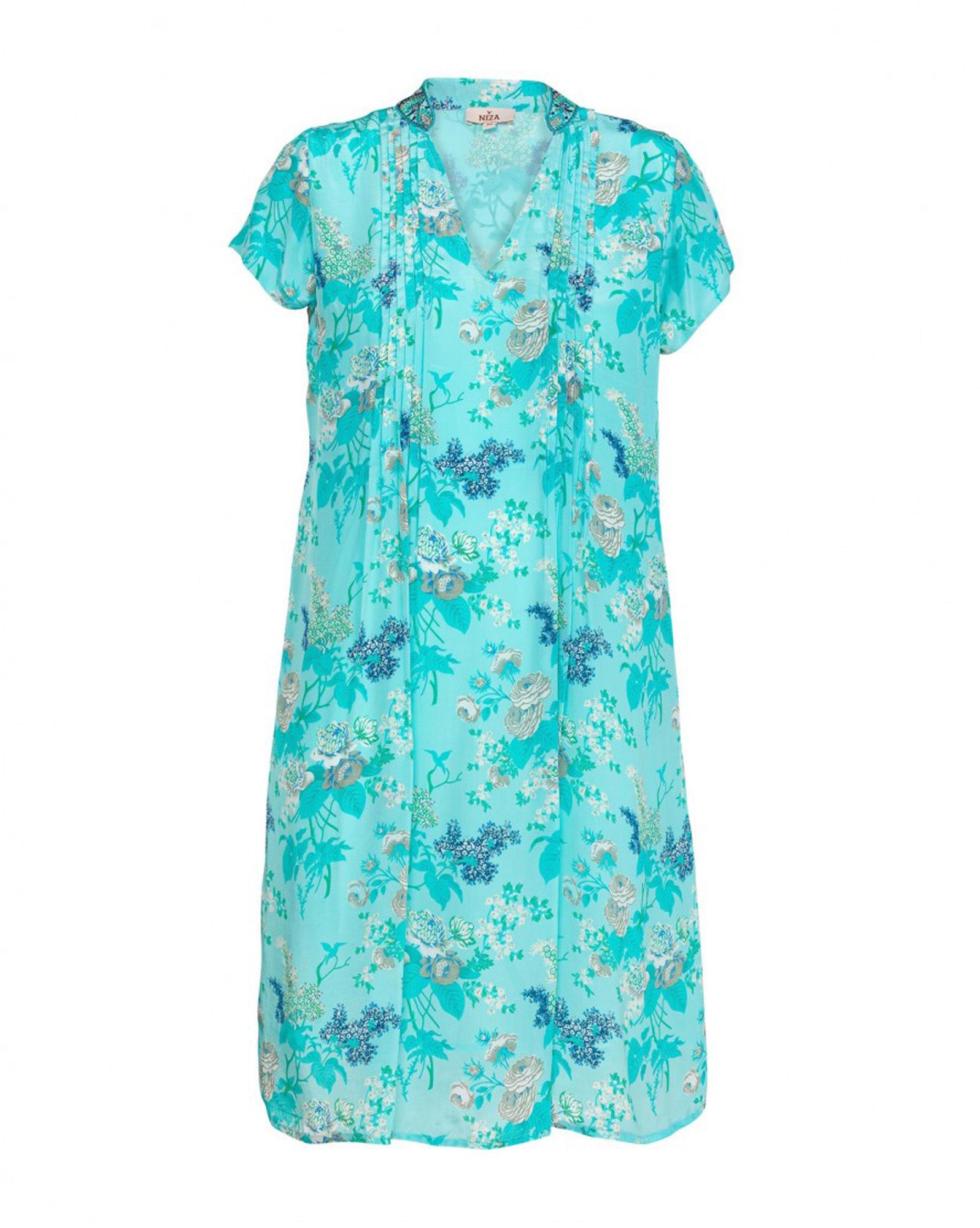 Vestido corto recto, con cuello en V, tableado en cuello hasta el busto, aplicaciones de bordados en cuello, estampado floral u manga corta.