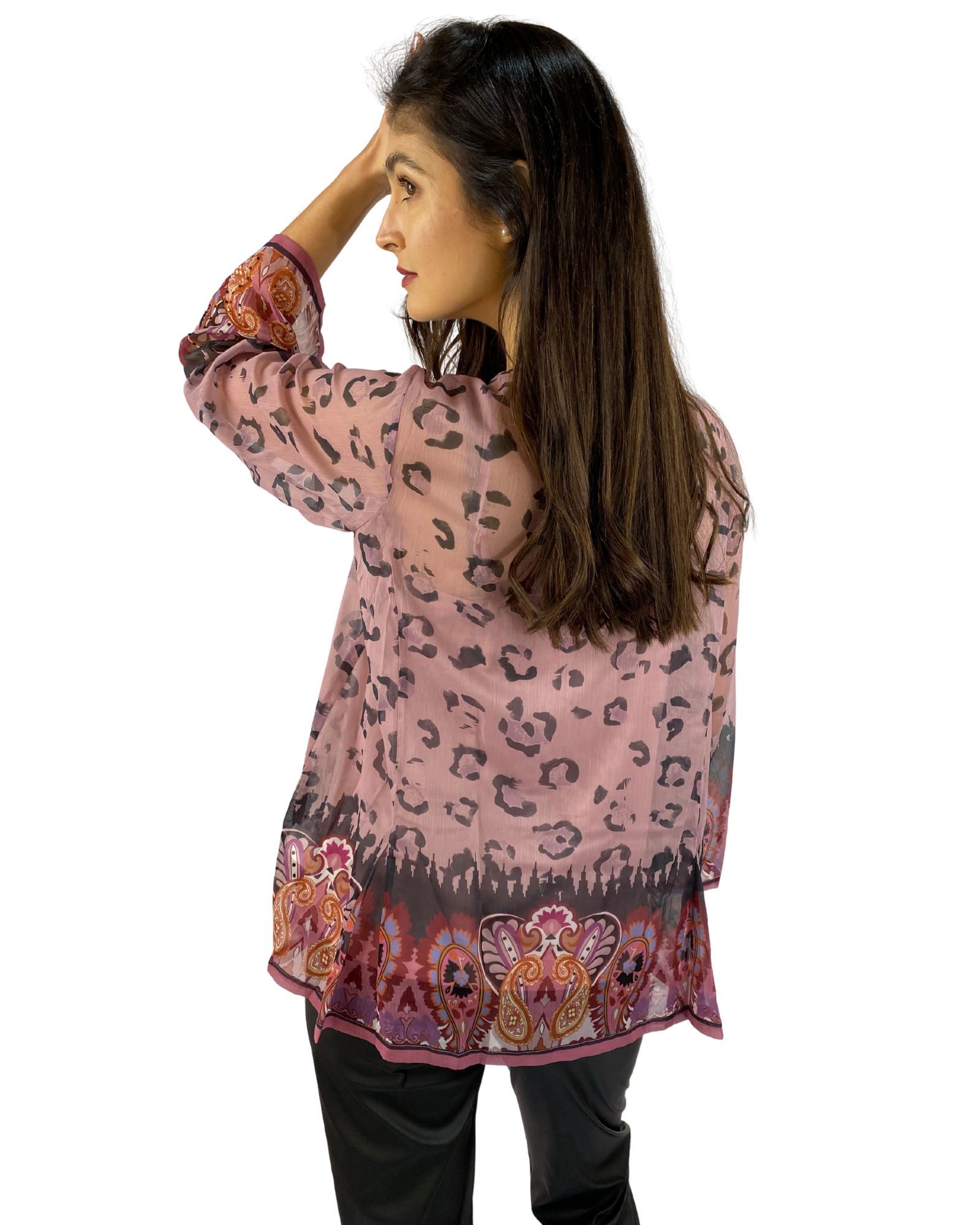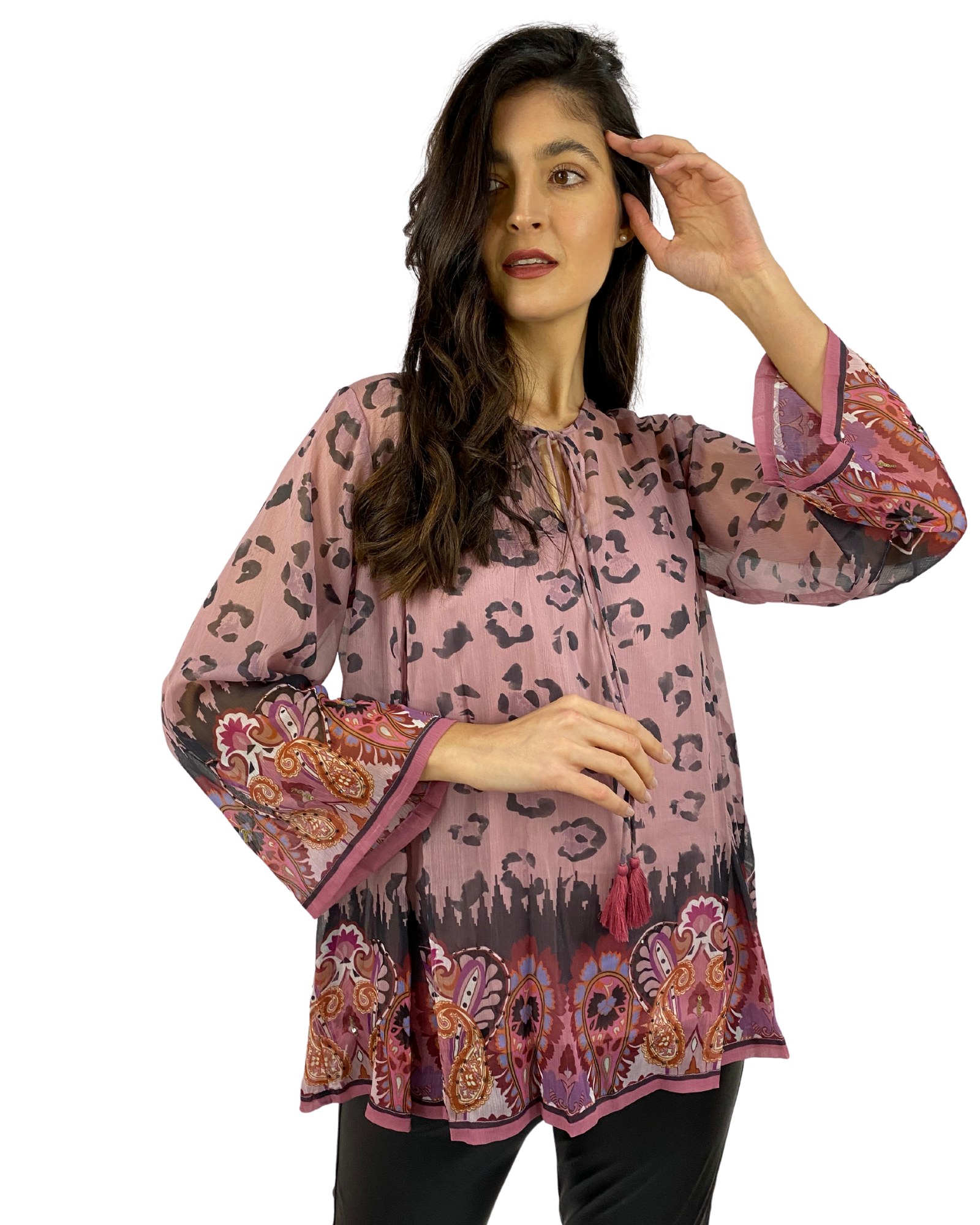 Blusa estampada de corte holgado. Cuello redondo. Cierre de cordón en el frente con terminación de pompones. Manga tres cuartos. Detalle bordado en hilo seda.