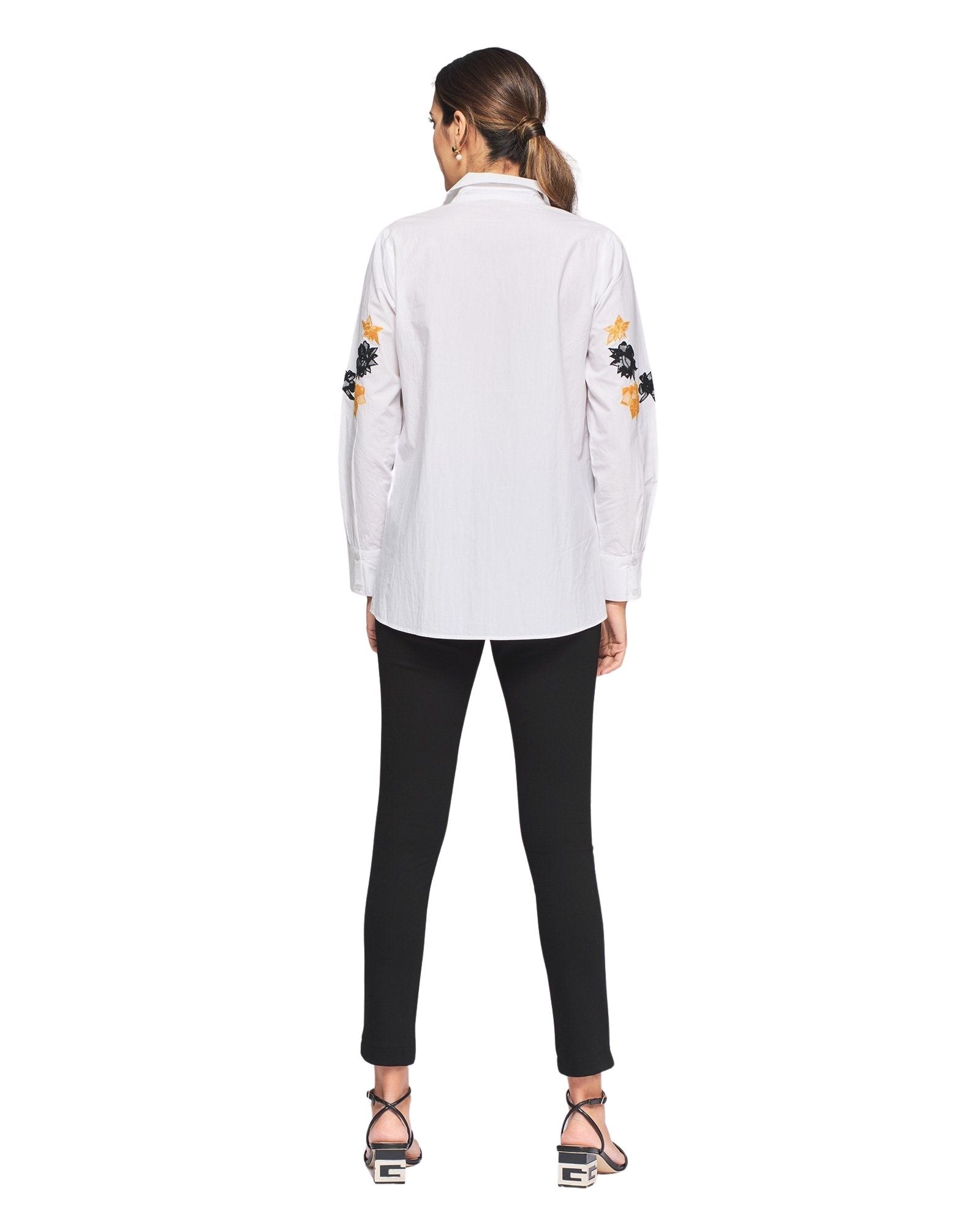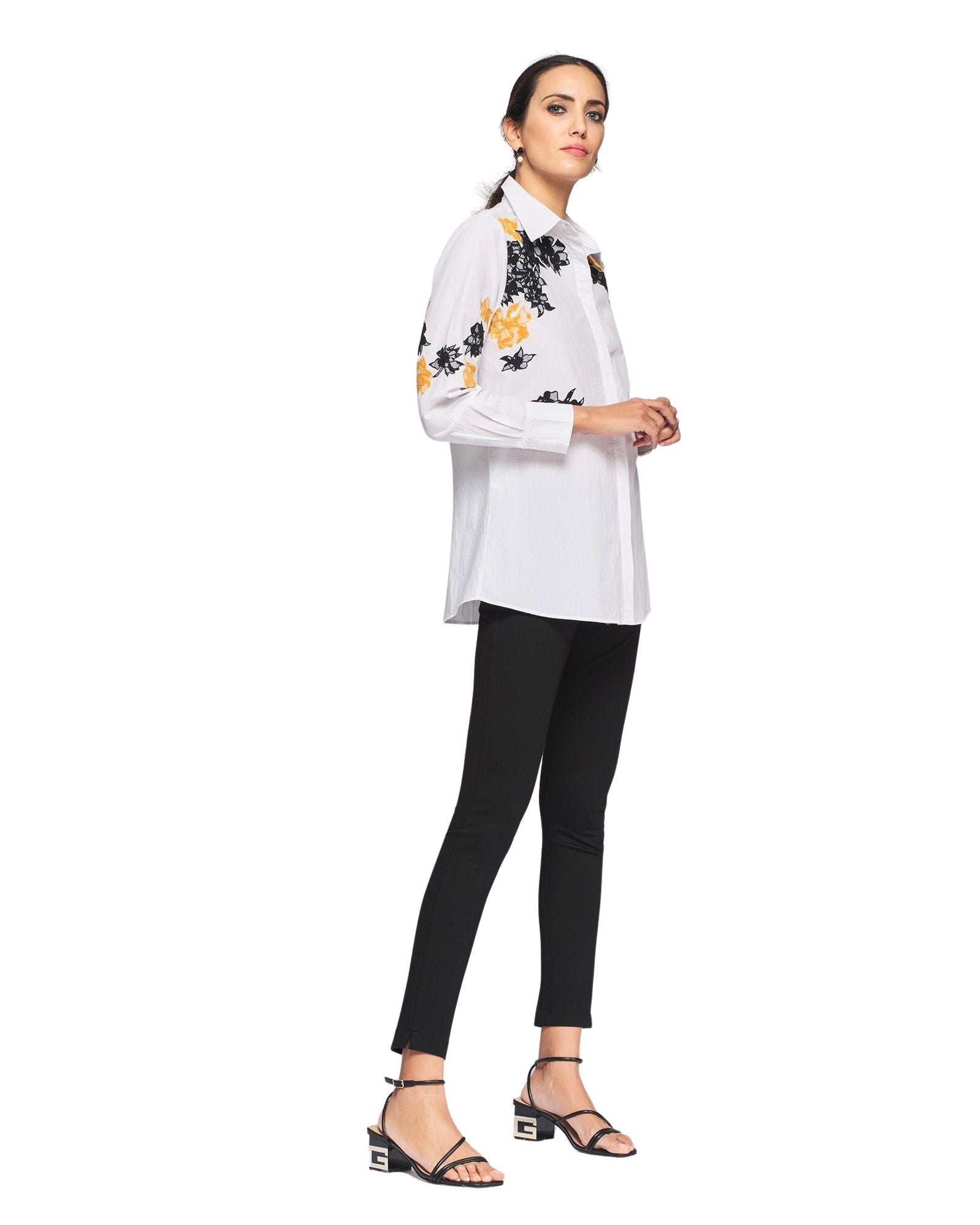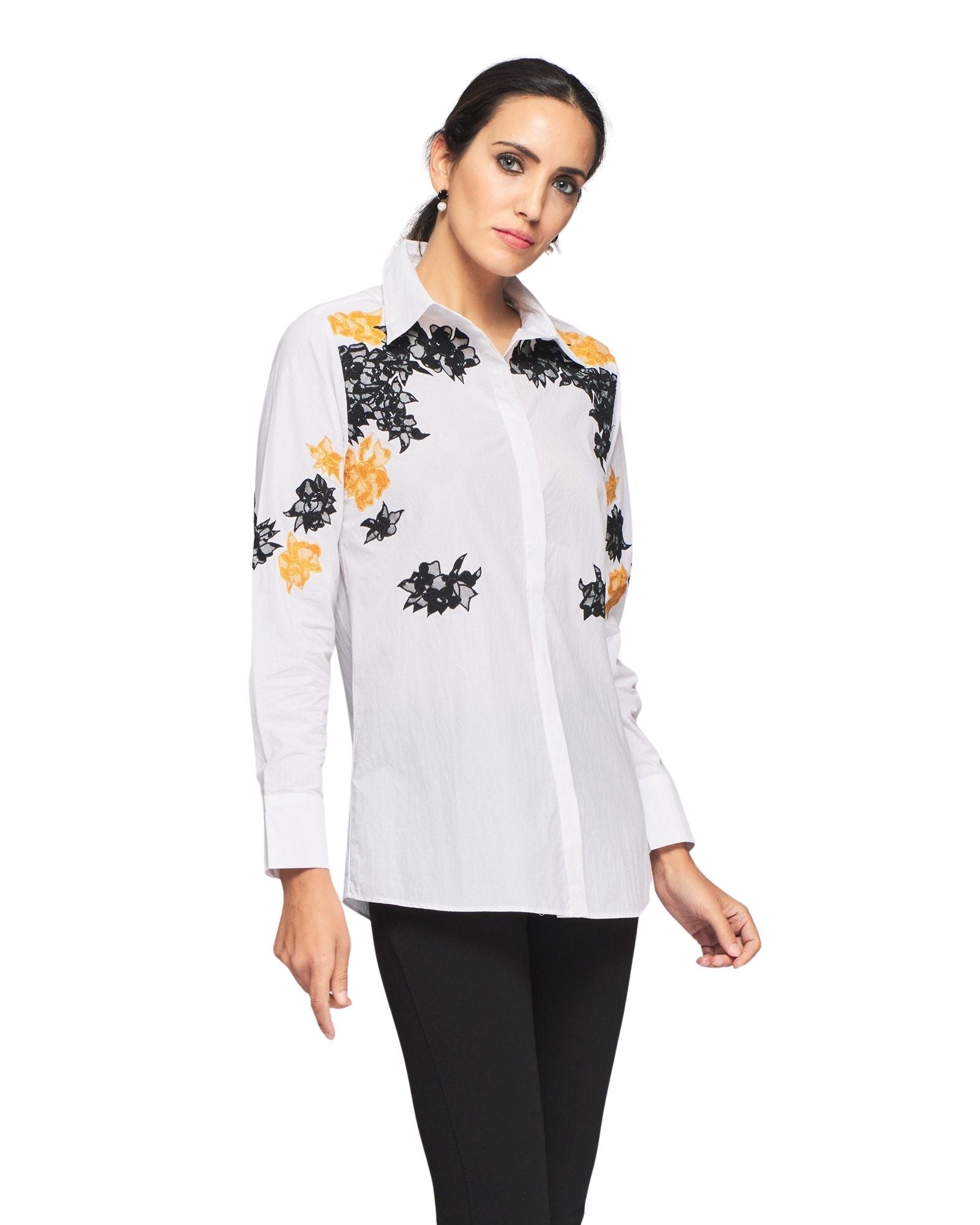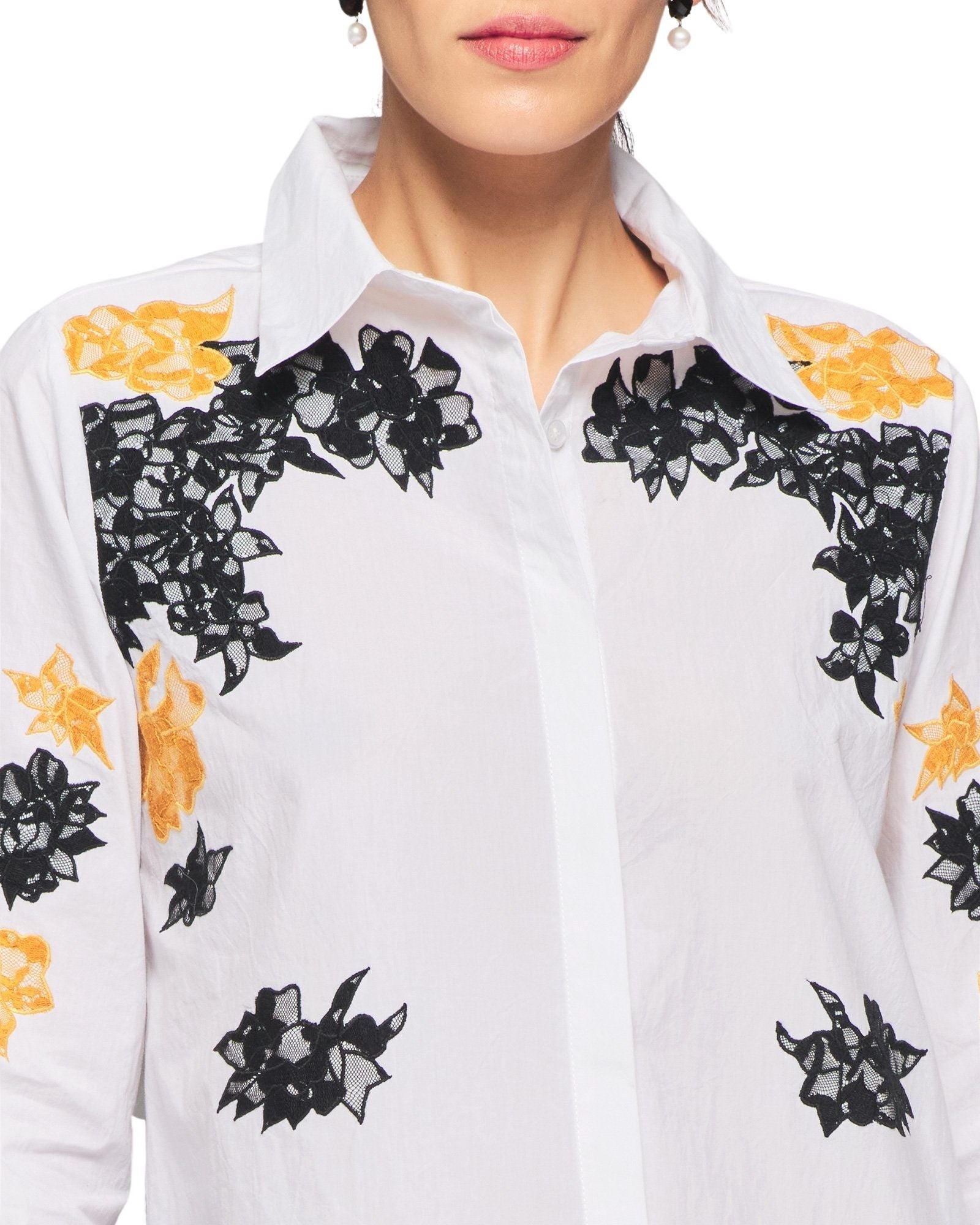 Blusa corte recto con apertura frontal de botones. Tejido ligero en poliéster, seda y viscosa. Cuello tipo camisa. Manga larga con puños abotonados. Aplicaciones de encaje en forma de flores en hombros y mangas.