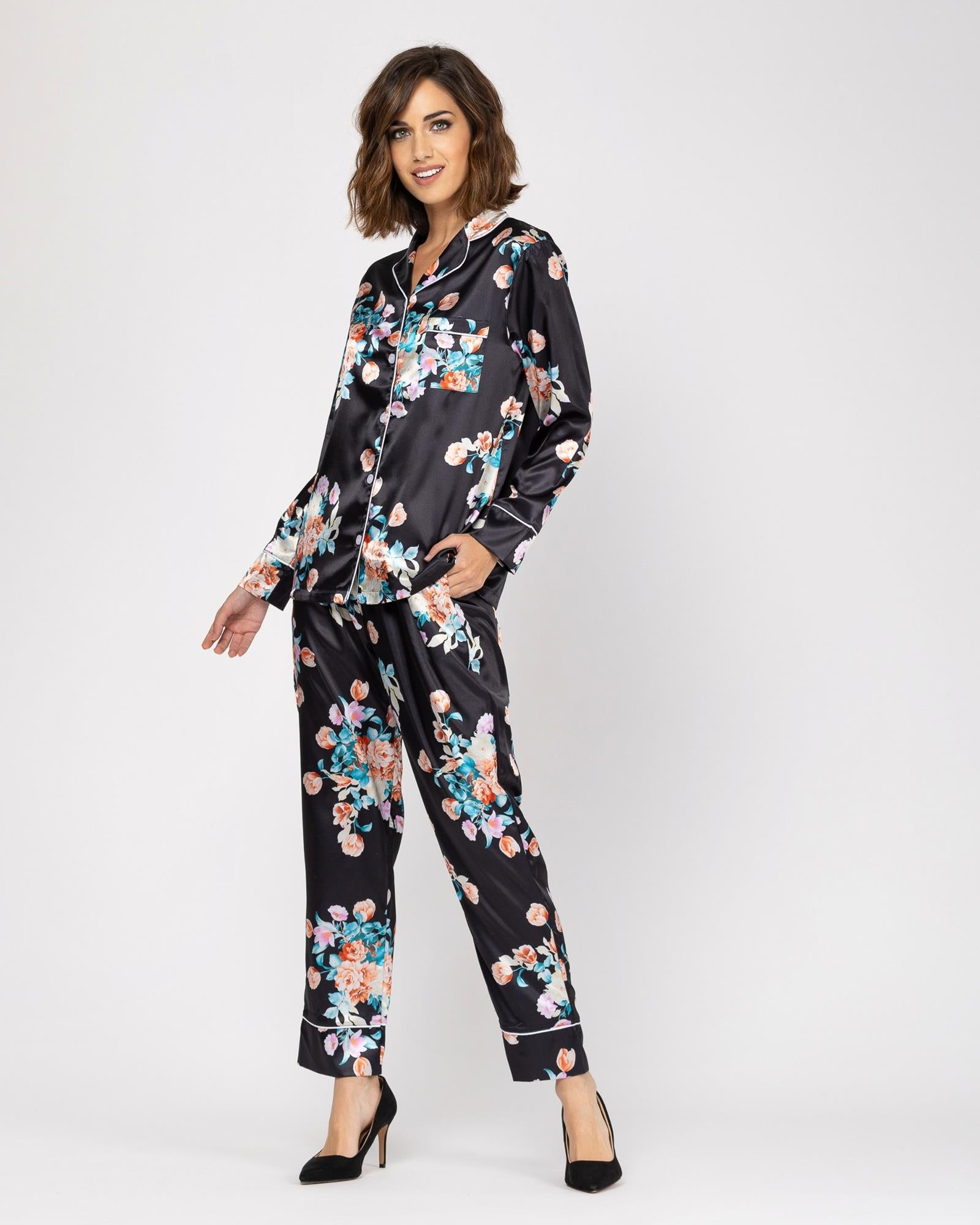 Pijama satinada de dos piezas con estampado floral. Corte holgado y cómodo. Camisa de diseño con solapas y bolsillo tipo parche en el pecho. Cierre con botones en la parte delantera. Manga larga. Pantalón con elástico en cintura. Cuenta con aplicación de franjas blancas en cuello, puño y bajo del pantalón a juego con los botones de la camisa.