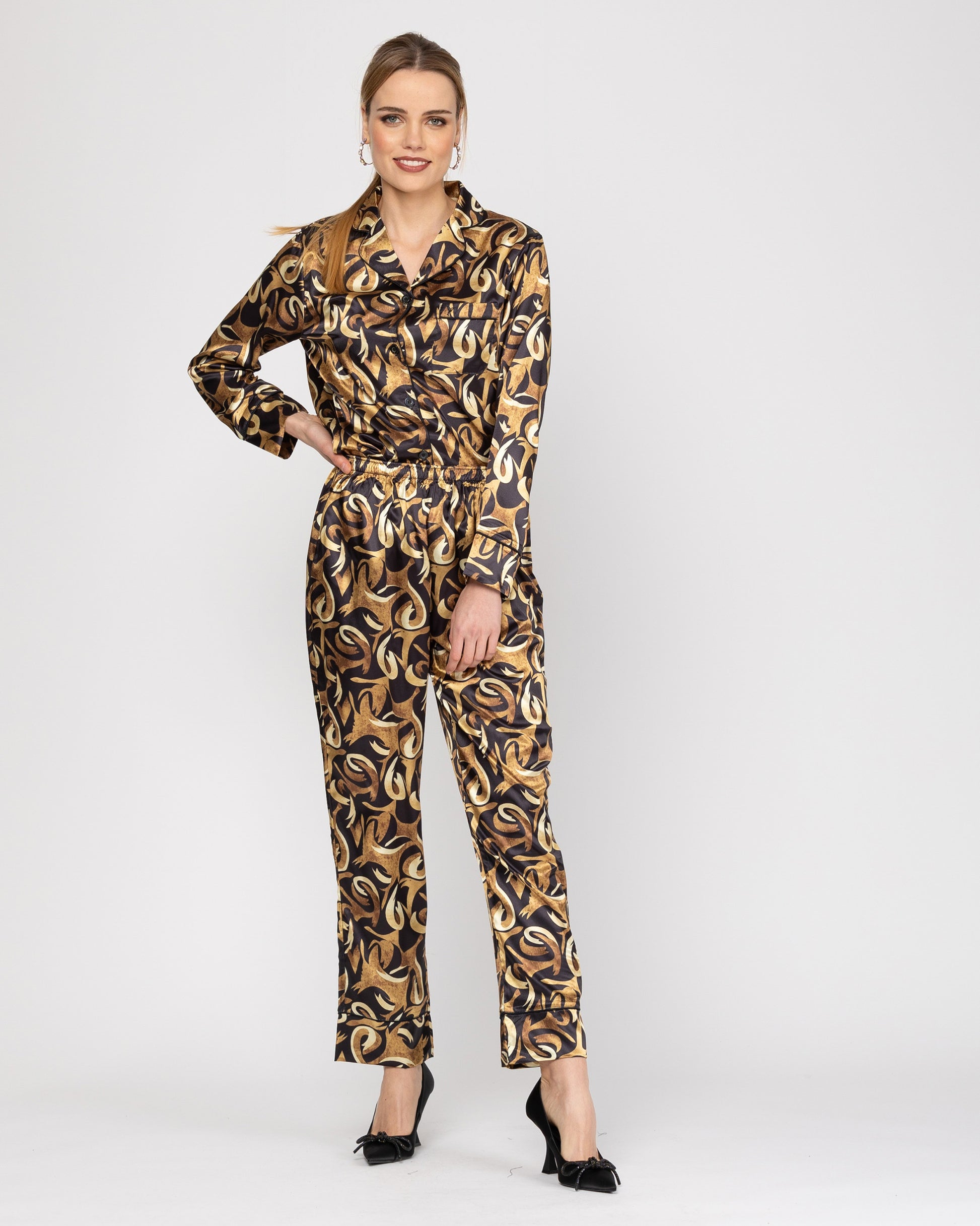 Pijama estampada de dos piezas con tejido satinado. Corte holgado y cómodo. Camisa de diseño con solapas y bolsillo tipo parche en el pecho. Cierre con botones en la parte delantera. Manga larga. Pantalón con elástico en cintura. Cuenta con aplicación de franjas negras en cuello, puño y bajo del pantalón a juego con los botones de la camisa.