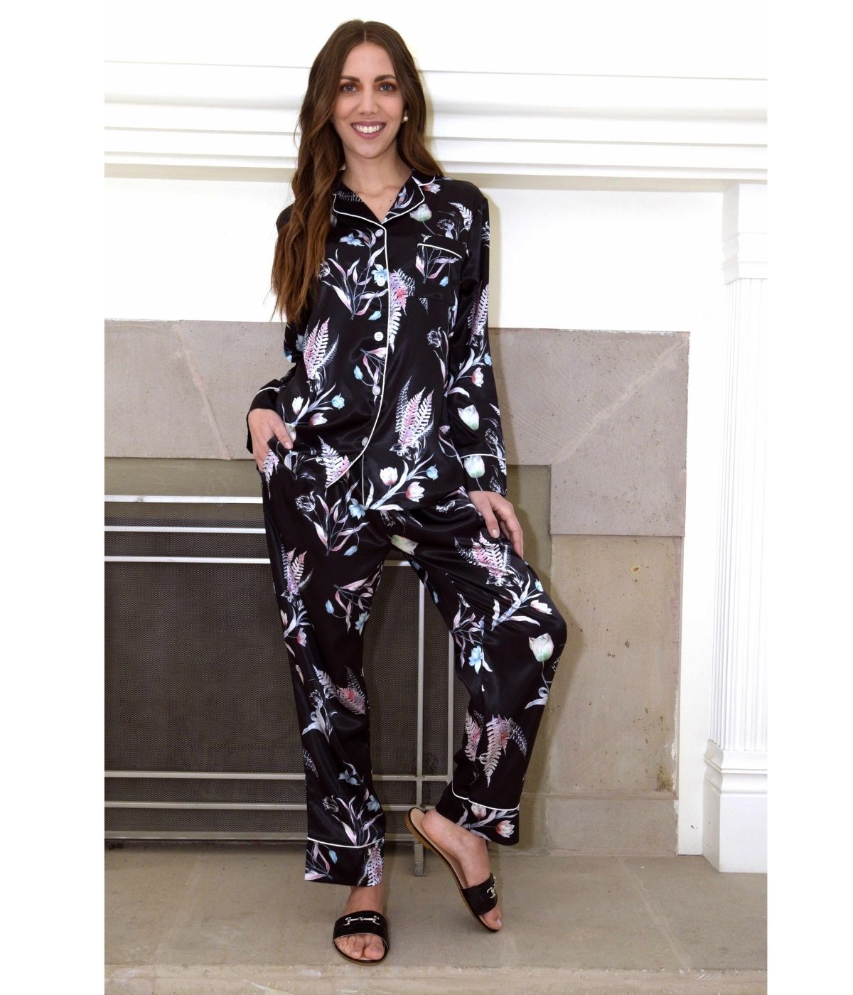Pijama satinada de dos piezas con estampado de hojas. Corte holgado y cómodo. Camisa de diseño con solapas y bolsillo tipo parche en el pecho. Cierre con botones en la parte delantera. Manga larga. Pantalón con elástico en cintura. Cuenta con aplicación de franjas blancas en cuello, puño y bajo del pantalón a juego con los botones de la camisa.