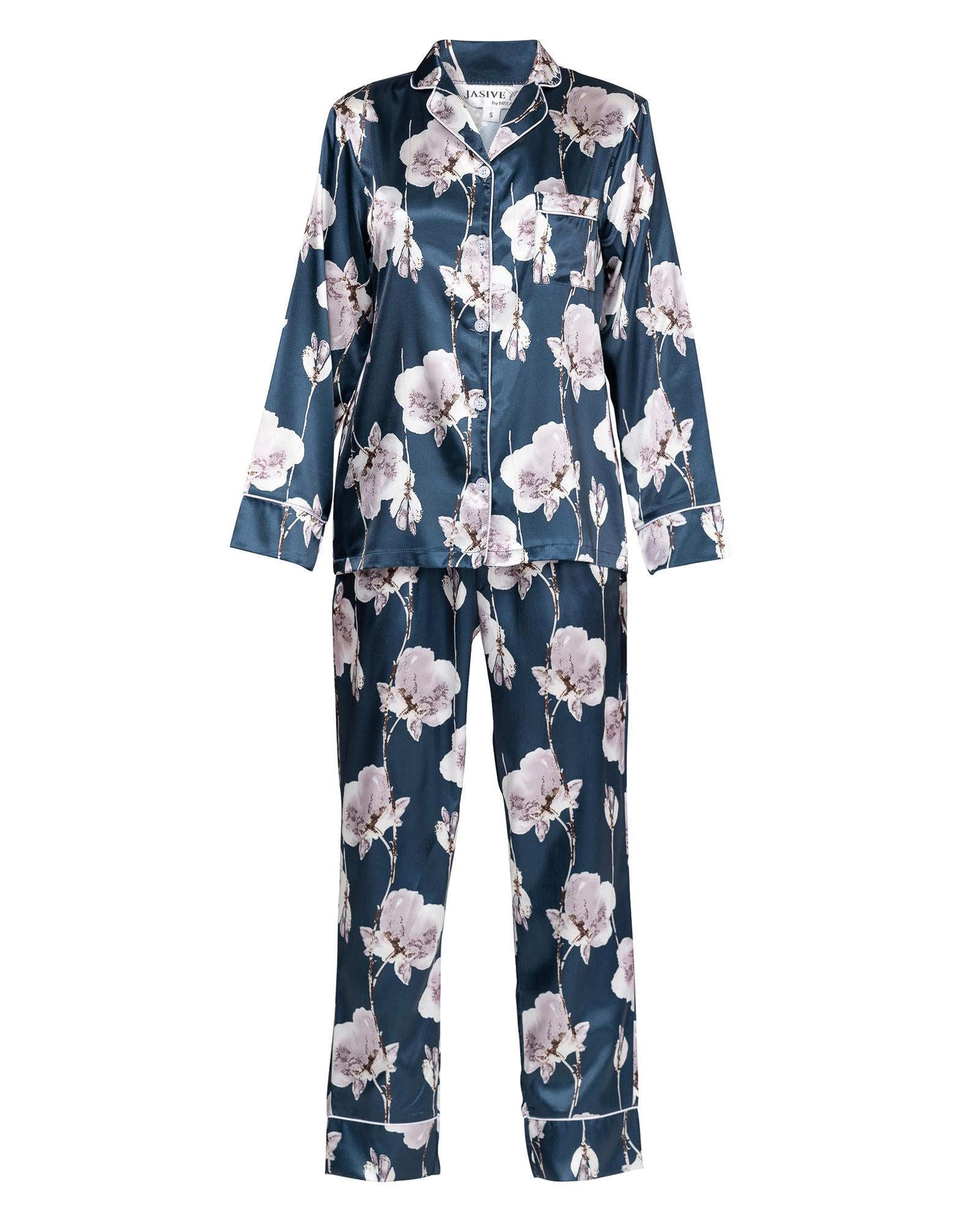 Pijama satinada de dos piezas con estampado floral. Corte holgado y cómodo. Camisa de diseño con solapas y bolsillo tipo parche en el pecho. Cierre con botones en la parte delantera. Manga larga. Pantalón con elástico en cintura. Cuenta con aplicación de franjas blancas en cuello, puño y bajo del pantalón a juego con los botones de la camisa.