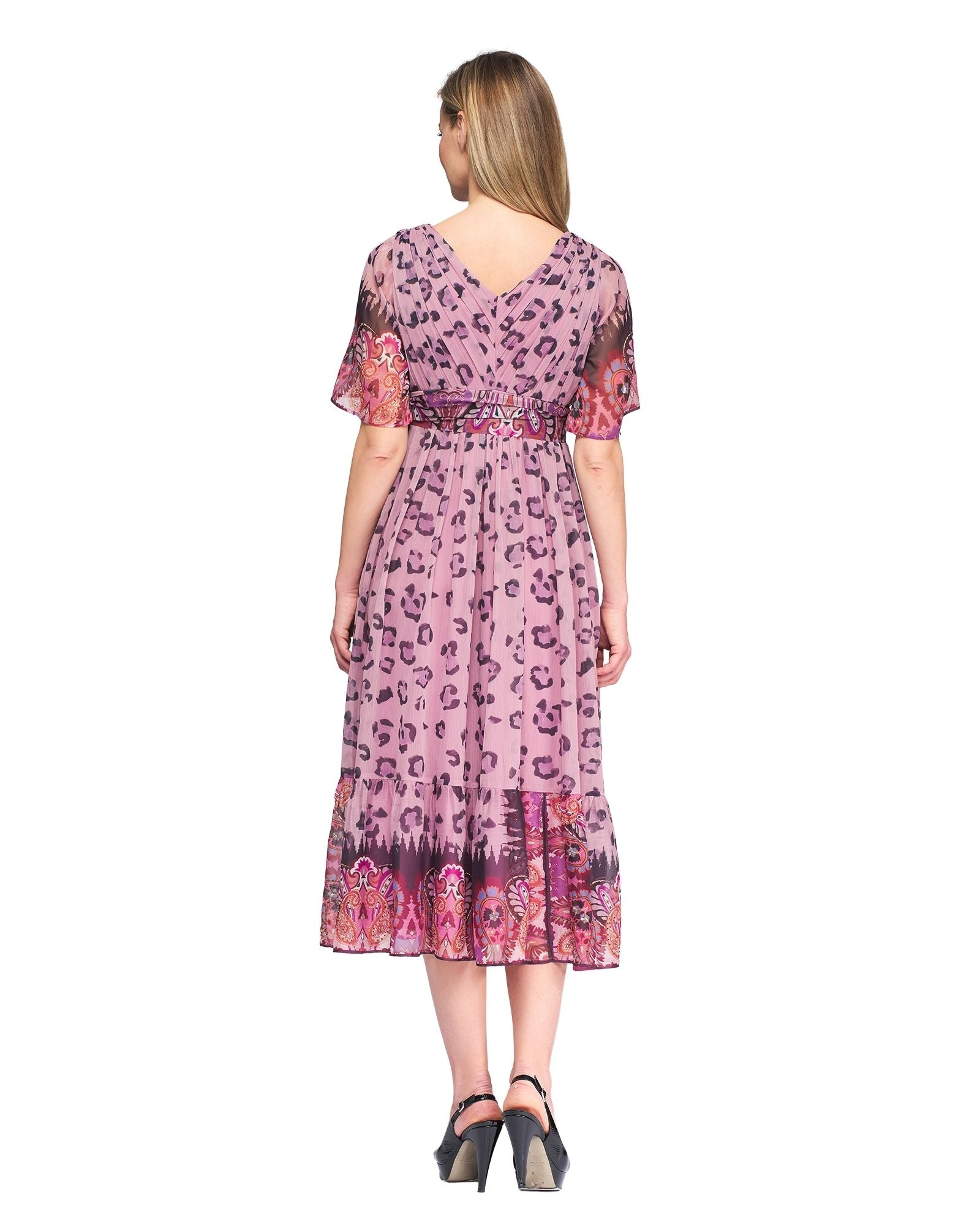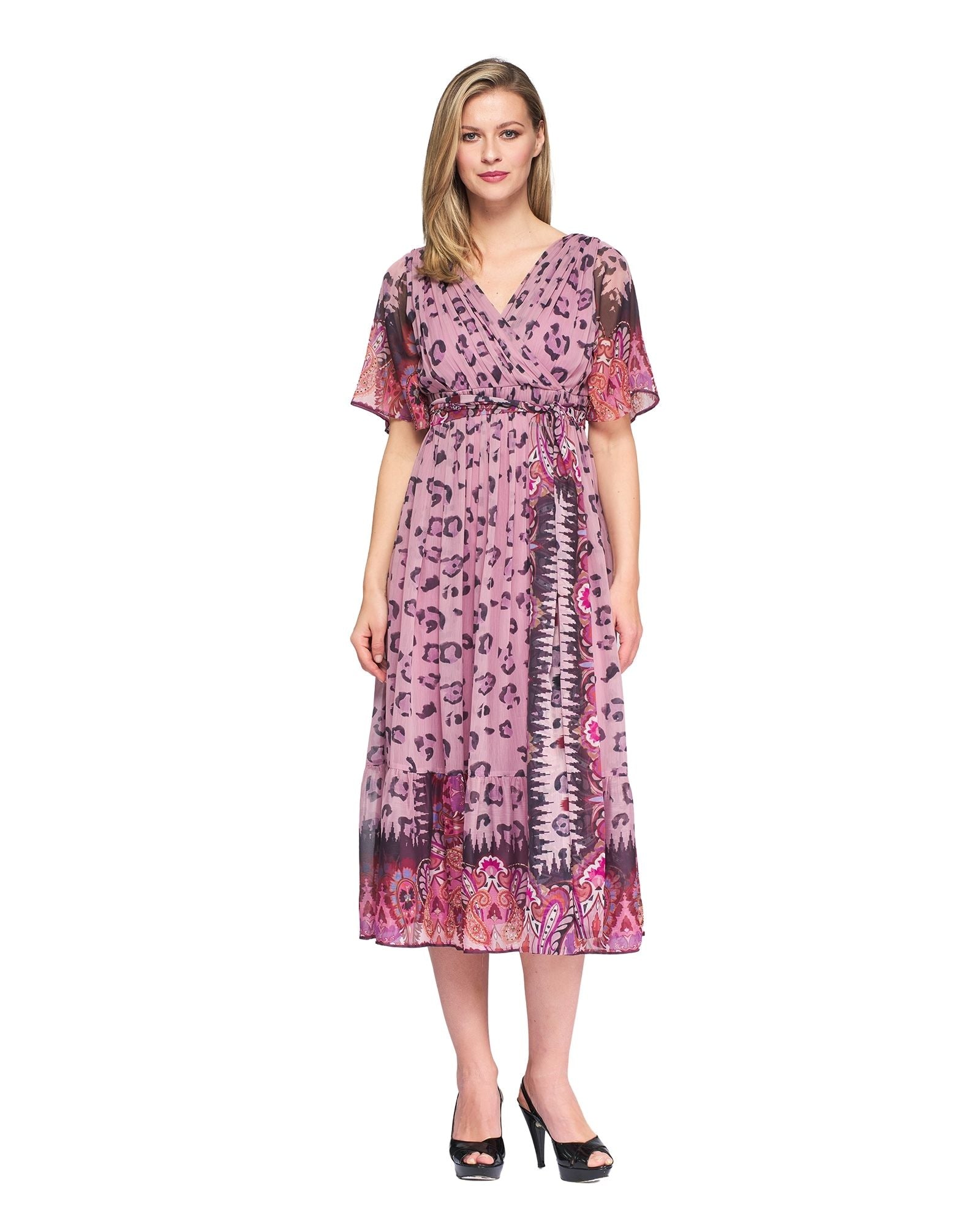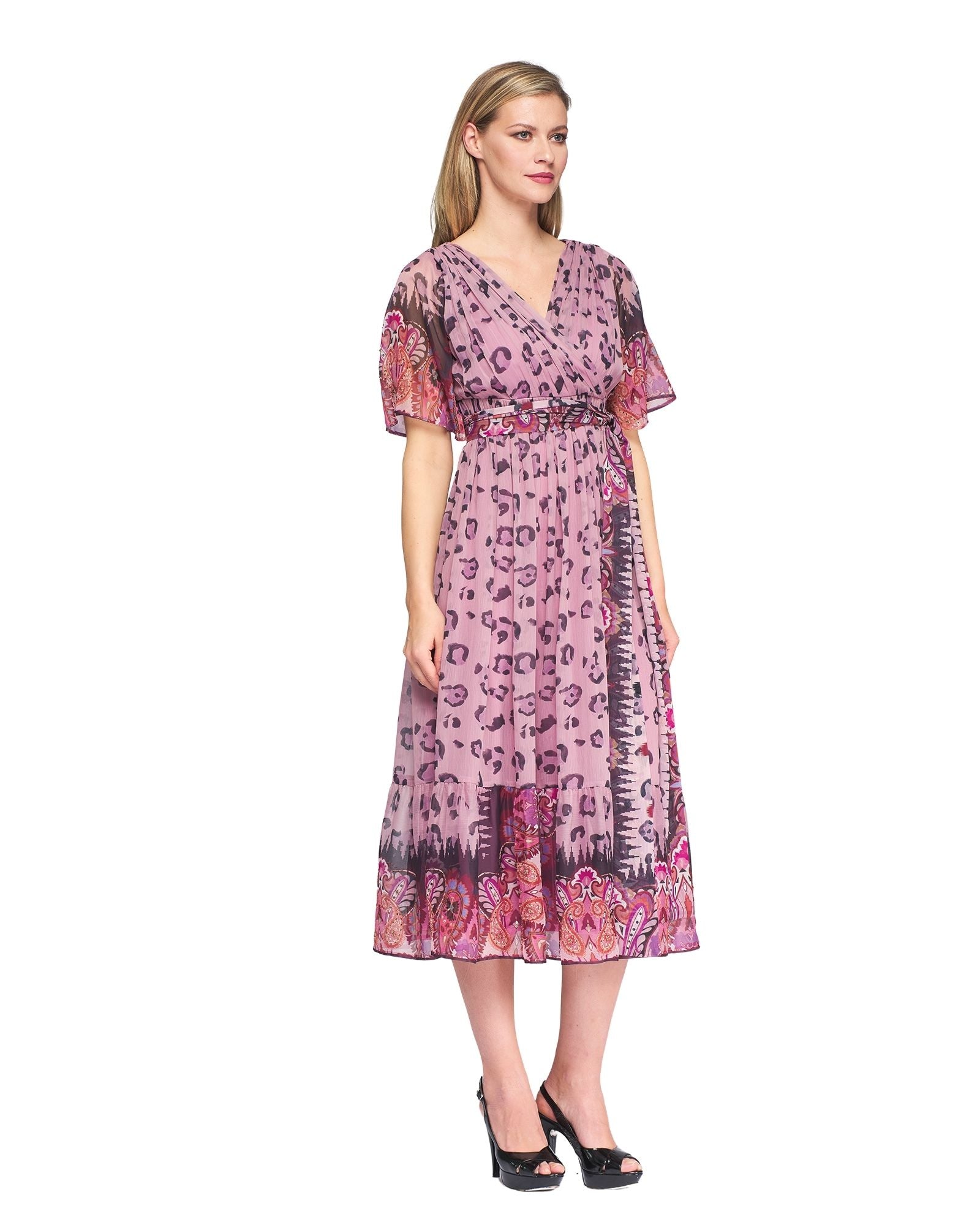 Vestido midi estampado. Escote cruzado en pico. Detalle plisado en el frente. Manga corte mariposa. Lazo en cintura para mejor ajuste con estampado a juego de parte baja de mangas y vestido. .