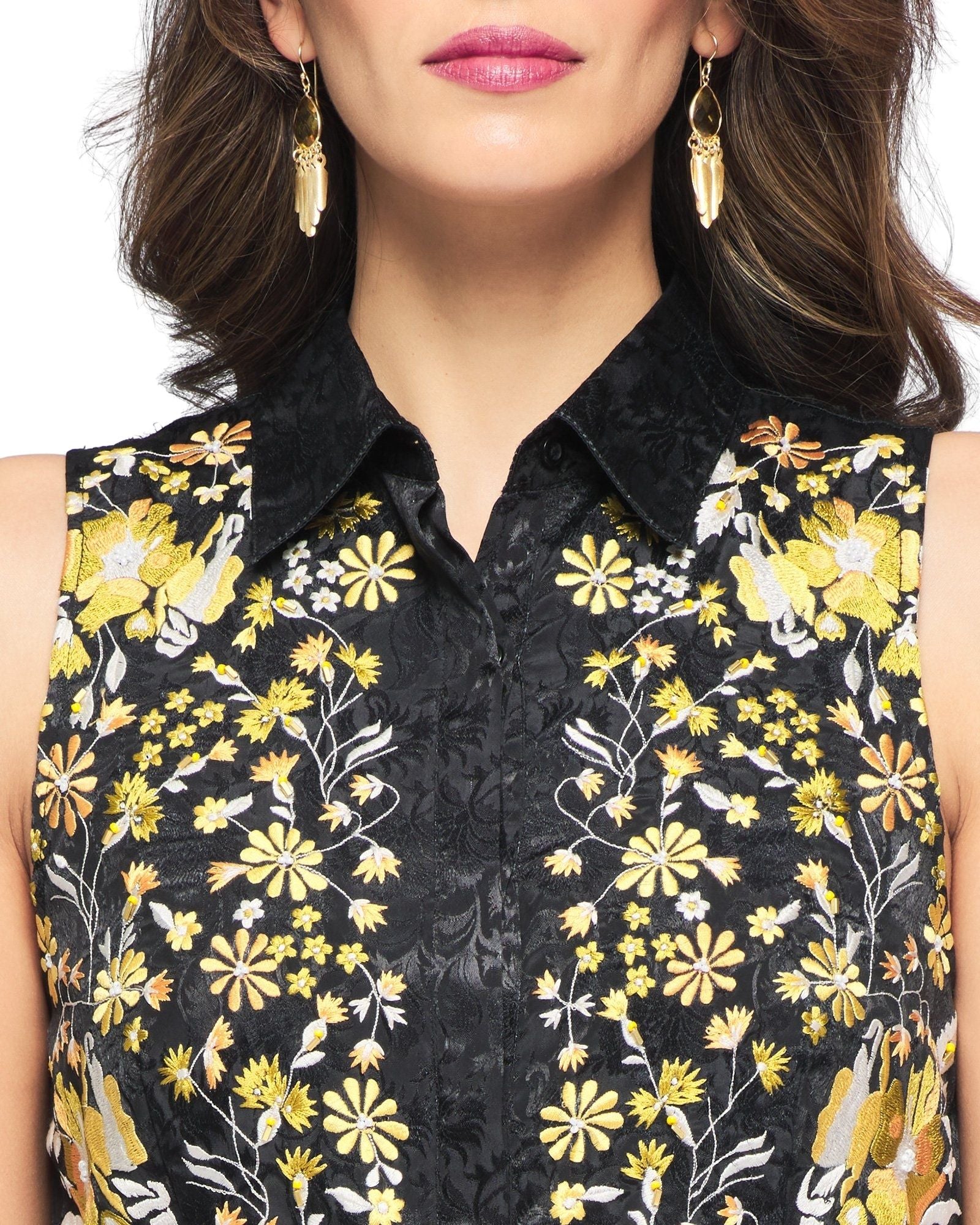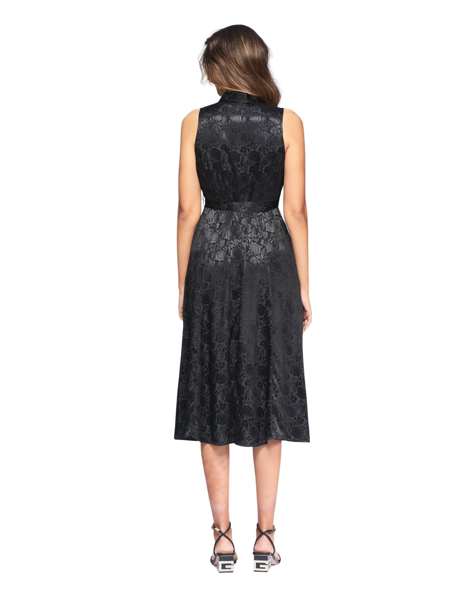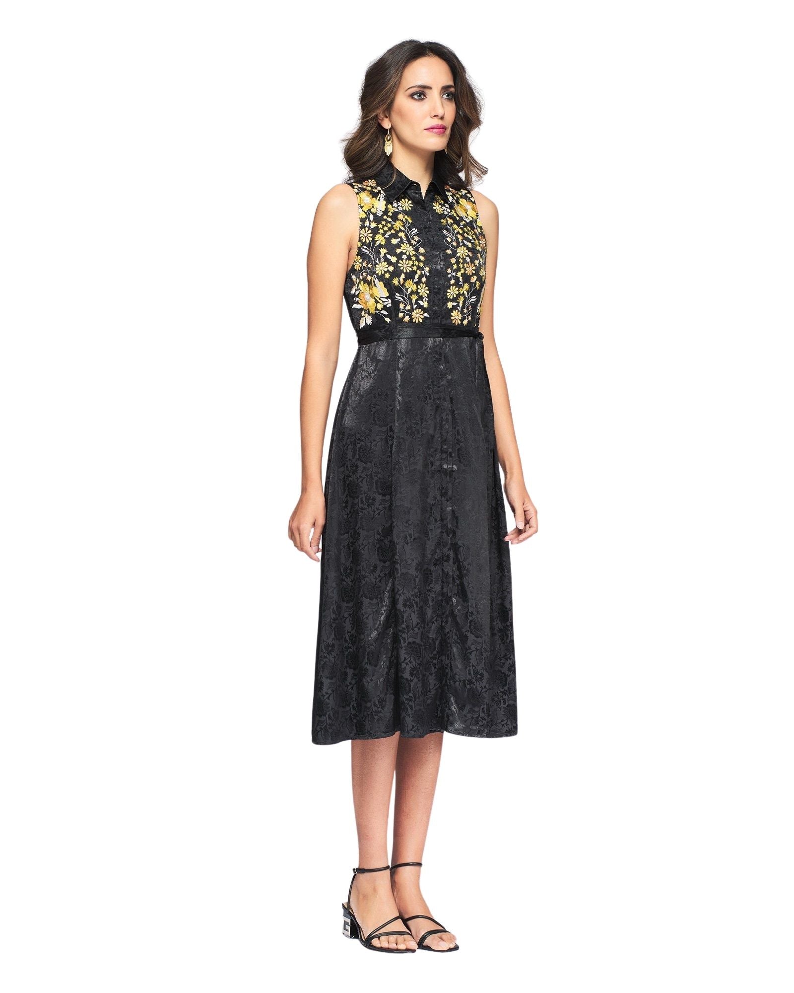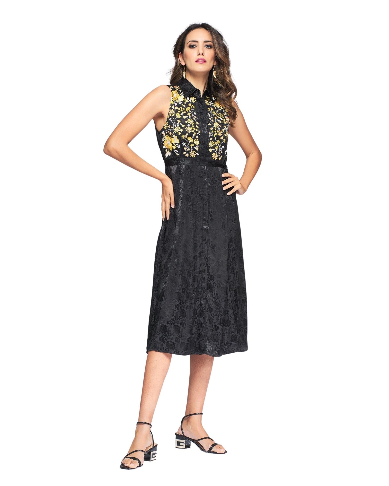 Vestido midi, satinado. Cuello tipo camisa con apertura frontal de botones ocultos. Sin mangas. Detalle bordado en hilo seda en el pecho. Cuenta con un lazo en la cintura para un mejor ajuste.