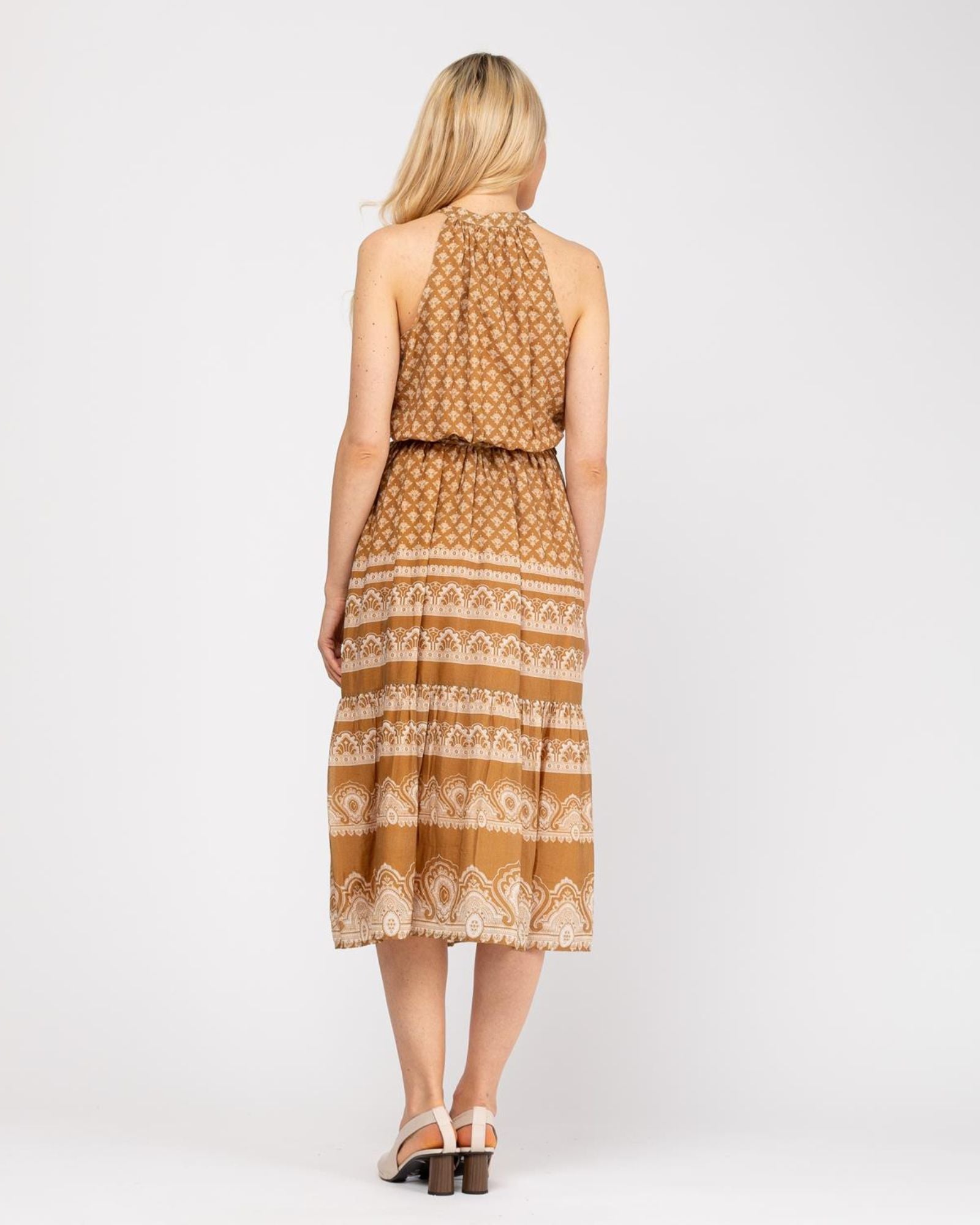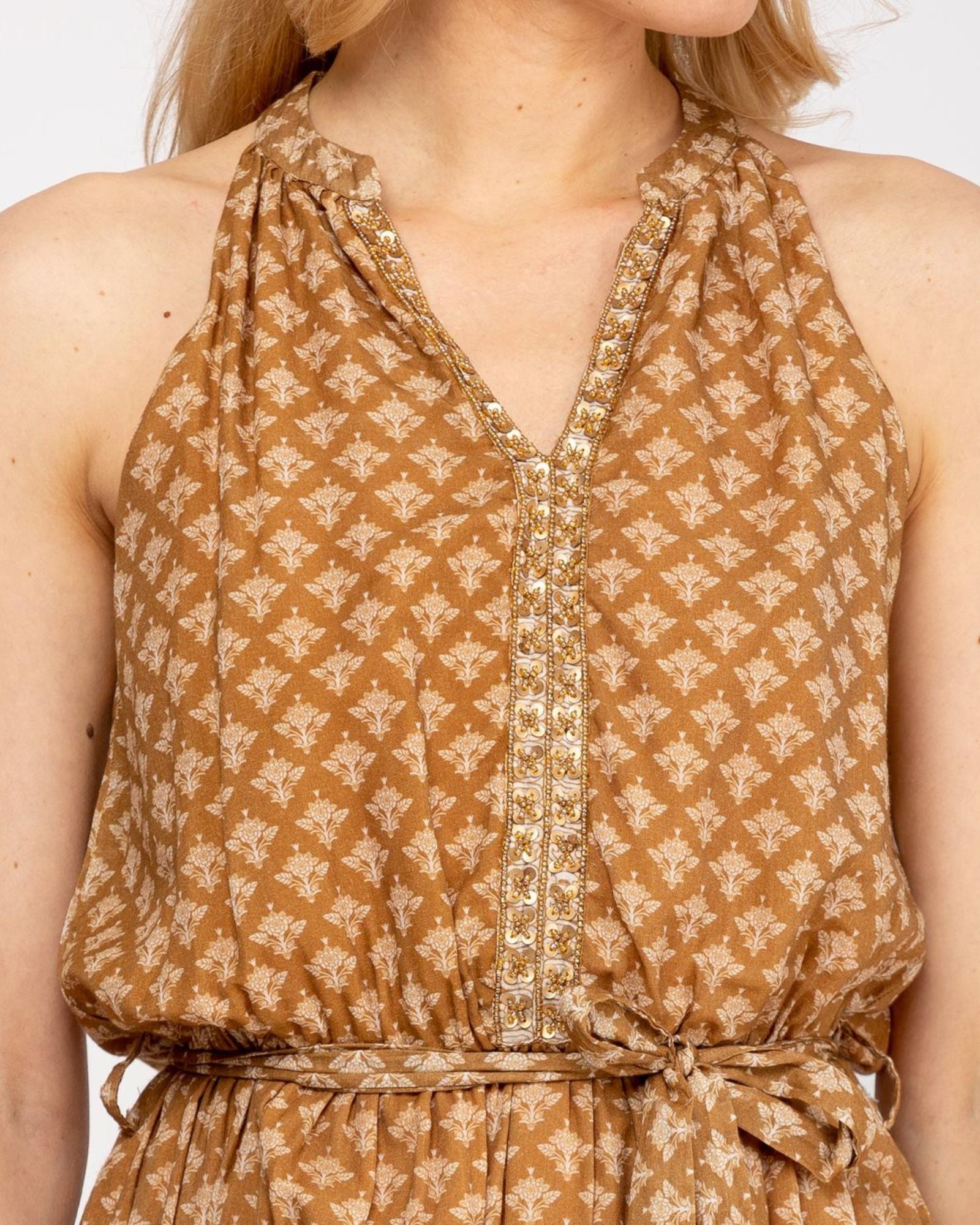Vestido largo corte A, con cinta ajustable en cintura, cuello halter con terminación en escote V, detalles de chaquira en pecho.