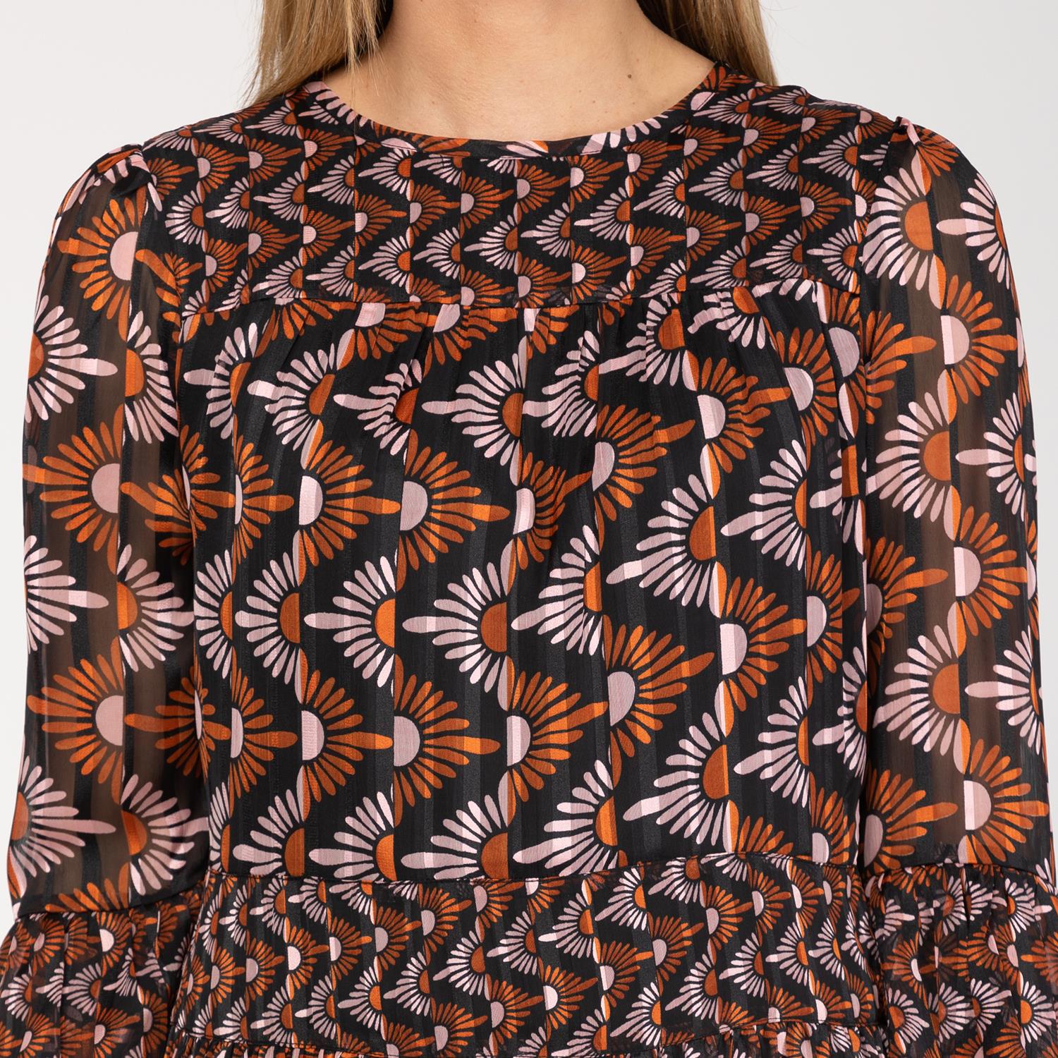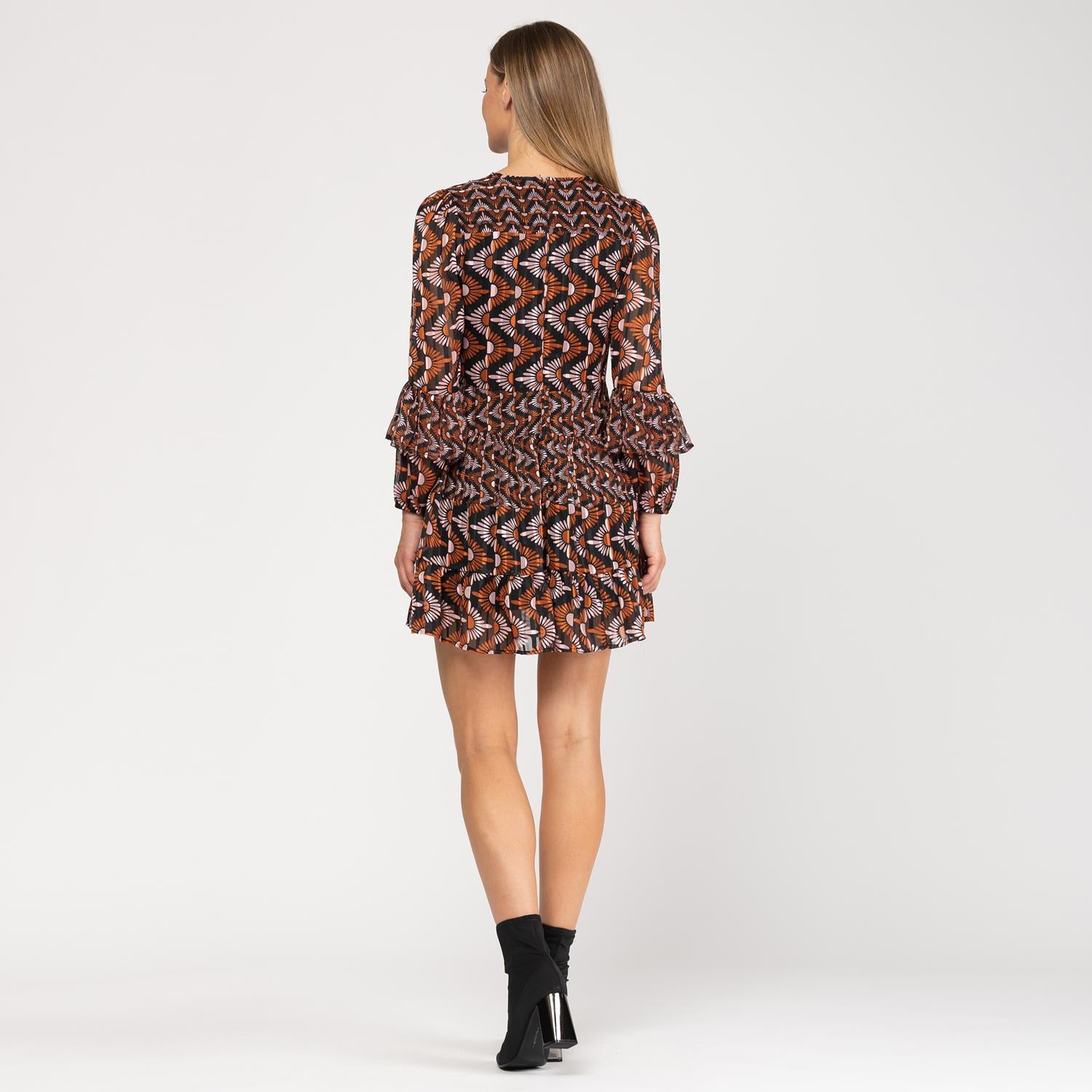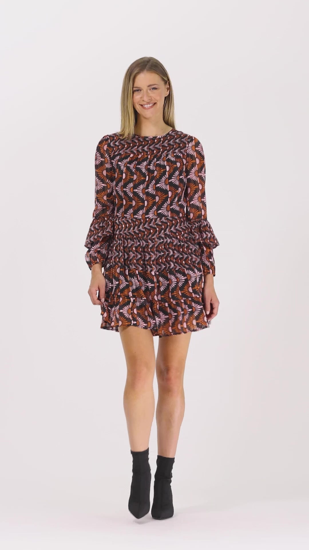 Este vestido corto ALTAIR presenta un atractivo estampado geométrico en tonos rosas que seguramente llamará la atención. Con un estilo moderno, este vestido de olanes ofrece una falda evasé con paneles para una apariencia elegante. Perfecto para cualquier ocasión, este vestido combina comodidad y estilo en un solo diseño.