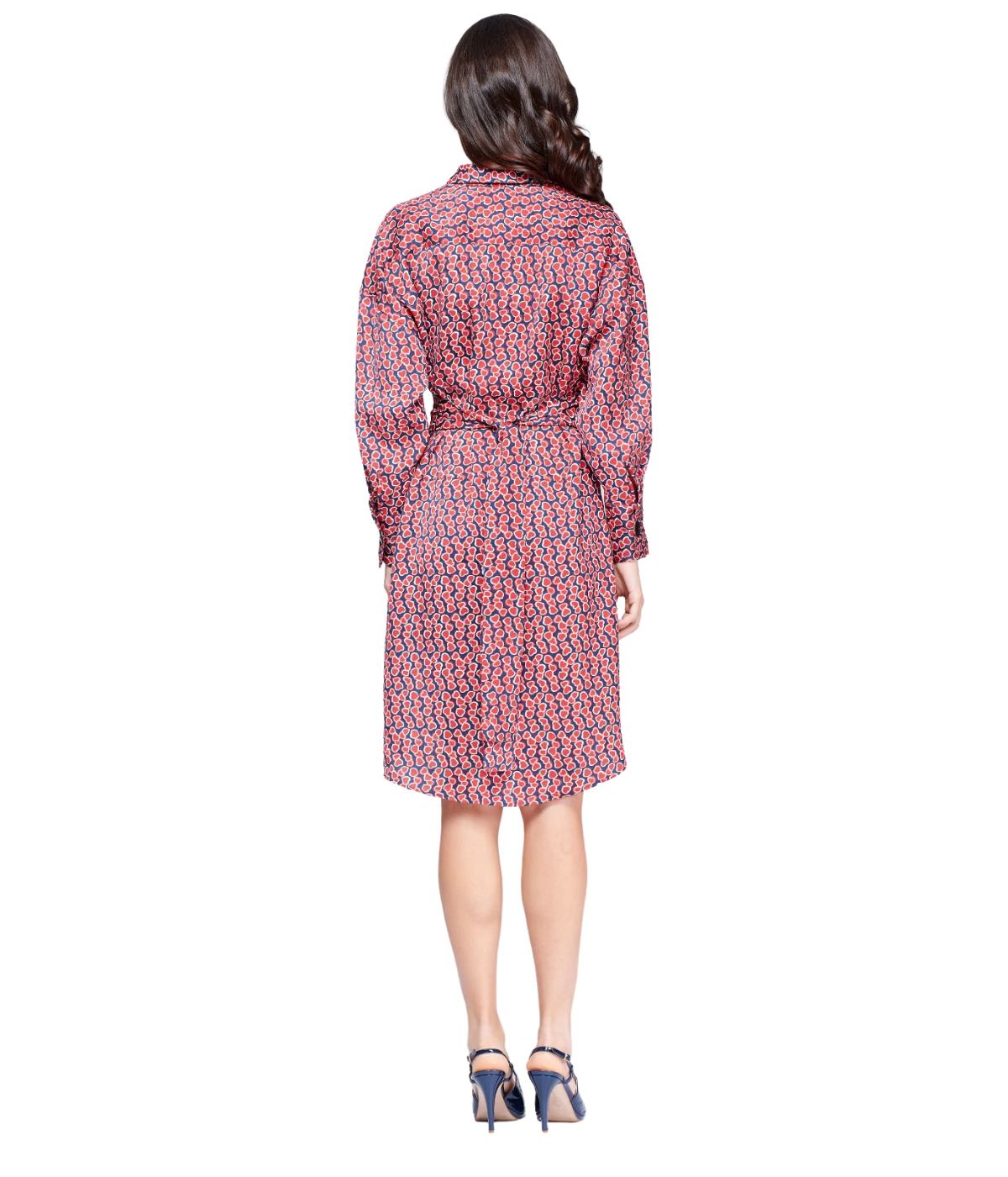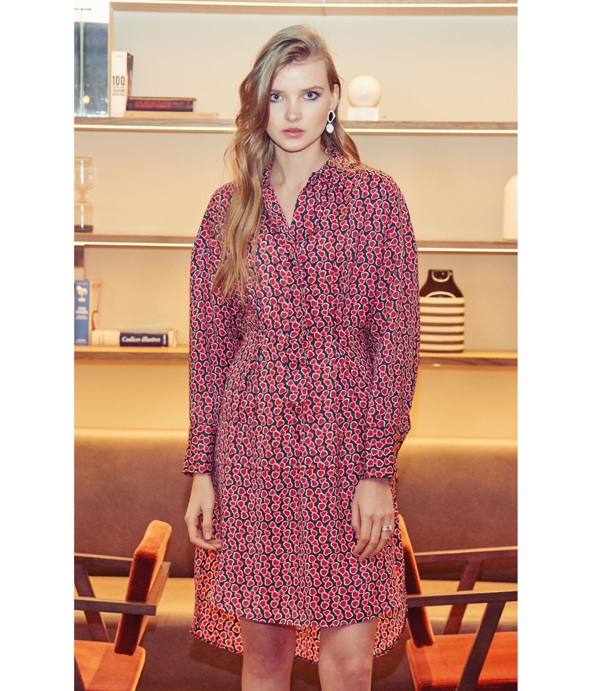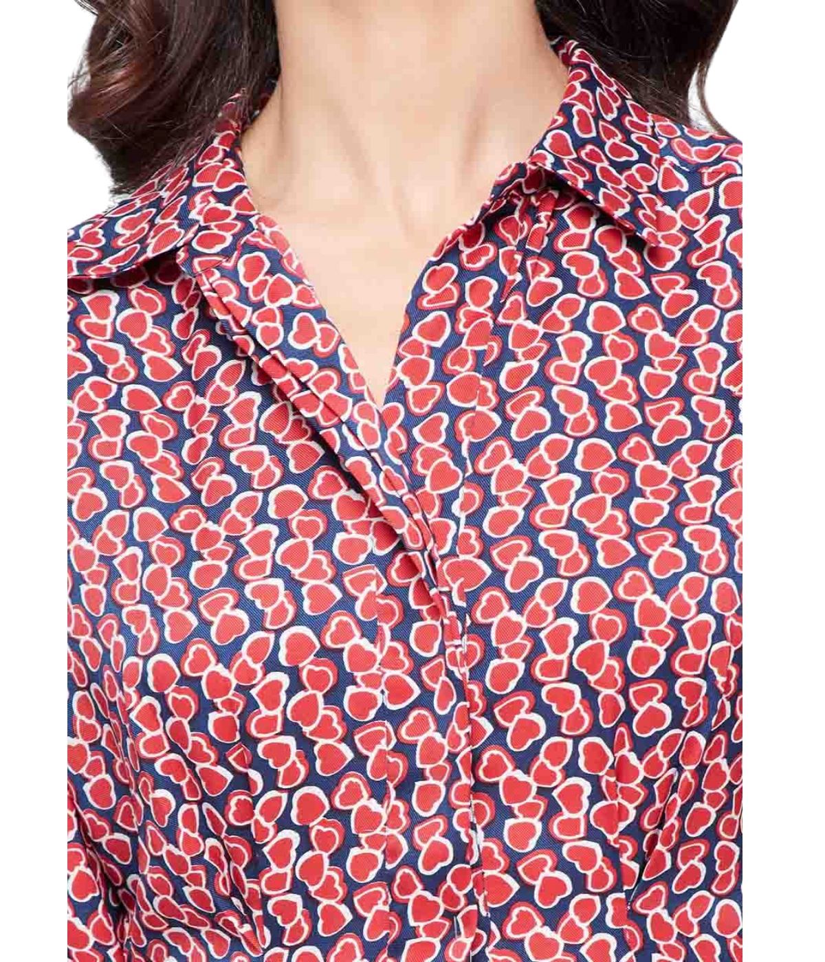 Vestido corto tipo camisero. Estampado de corazones. Confeccionado en poliéster satín. Corte recto con cauda en la parte de atrás. Cuello tipo camisa. Cierre de botones ocultos en la parte de enfrente. Manga larga terminada en puño abotonado. Lazo en cintura para definir silueta.